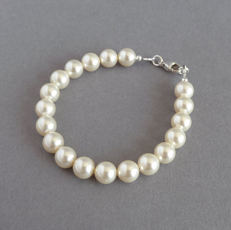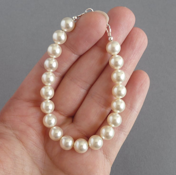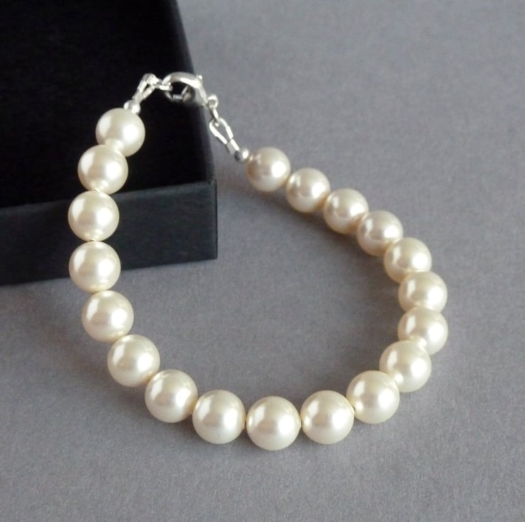 To create this simple pearl bracelet, I have used 8mm cream glass pearls. This single strand of lustrous, ivory pearls would make the perfect addition to a wedding outfit for a bride, bridesmaid or mother of the groom/bride.