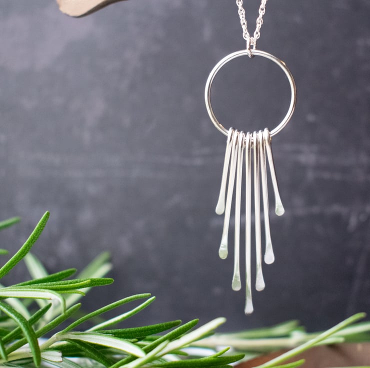Sterling silver necklace in a stylised tassel design. Handcrafted from silver wire, I have created an open circle with 7 'droplets' which hang freely around the ring, creating a lovely movement in the piece when worn.