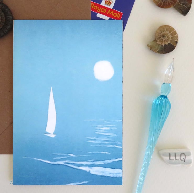 A blank greeting card reproduced from my original monoprint of a summer evenings sail in the moonlight. Each card measures 6x4 inch (10x15.5cm).