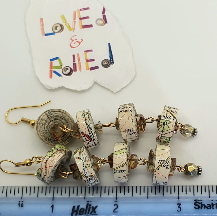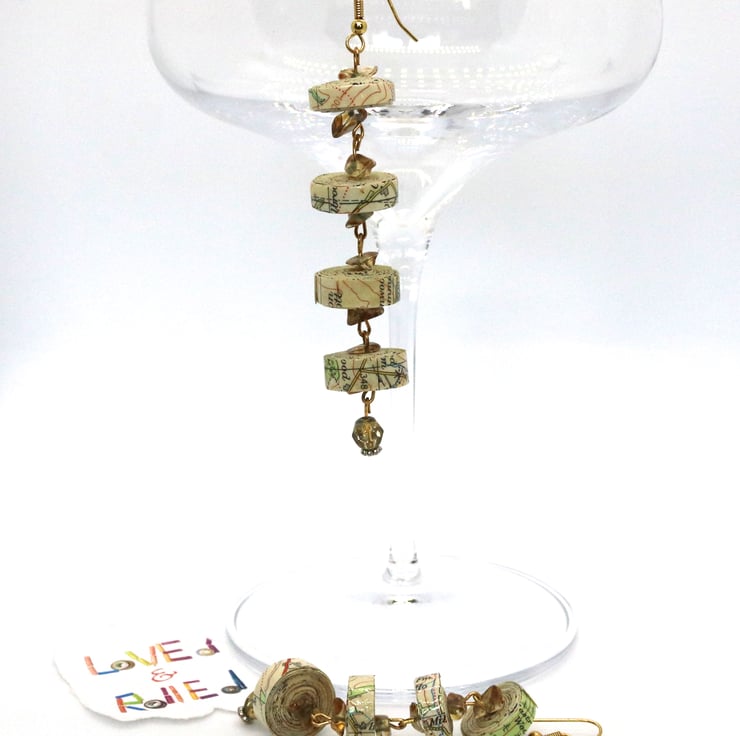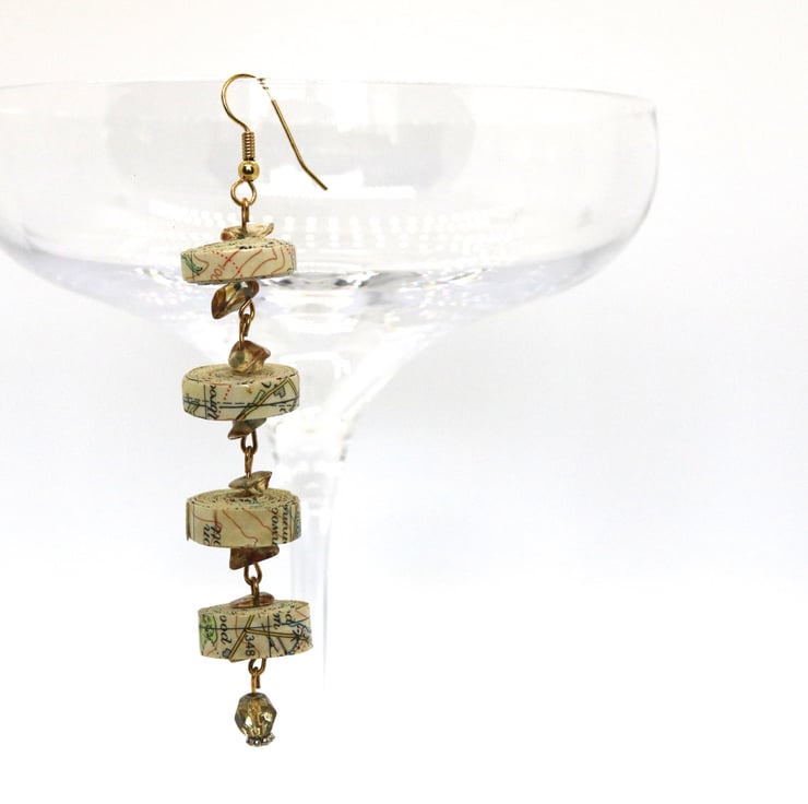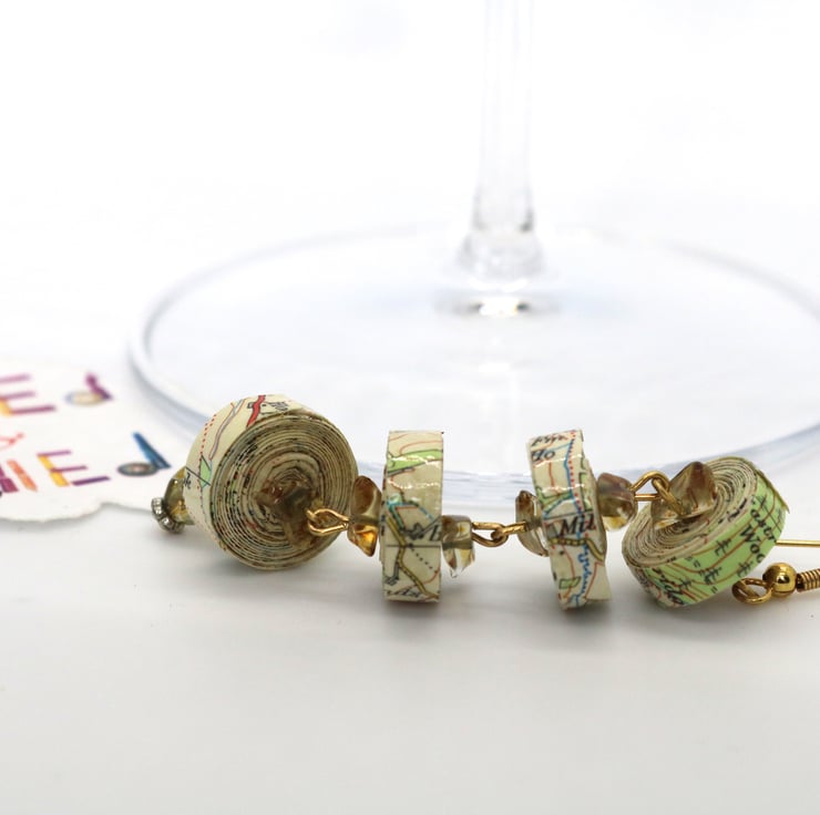 Long dangling gently moving earring made of circles of paper beads. These little circles are made of an old OS map which has been cut into strips, hand rolled into circular beads which were then varnished. Each bead was then decorated with asymmetrical pre-loved glass beads and linked to the other beads, the asymmetry causing the gently swaying movement. The ear findings are gold plated. The drop from the top of the earring hook to the bottom bead is 9 cm