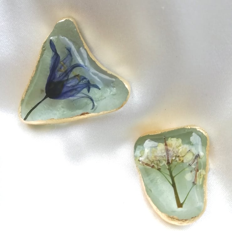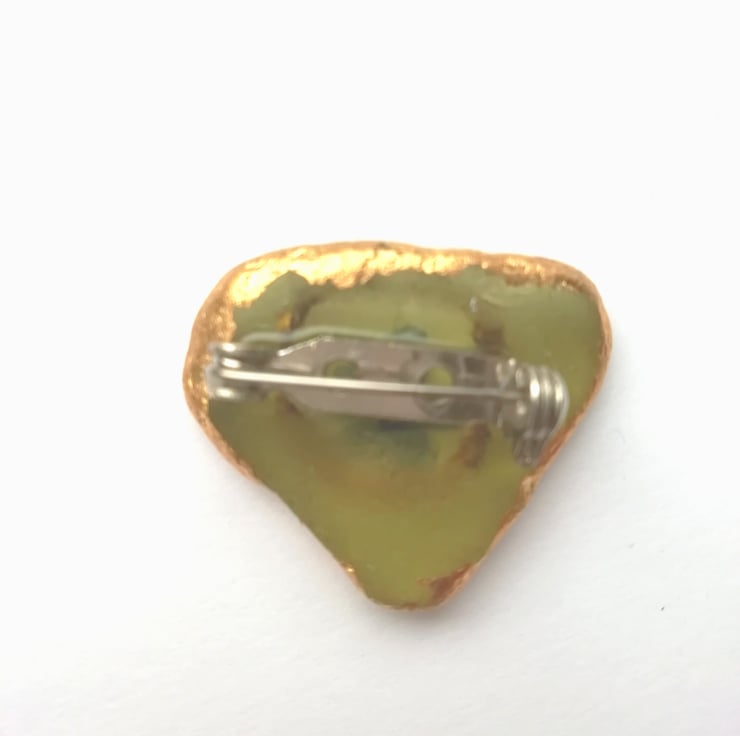 This piece of green beach glass from the Kent coast has been smoothed over years. The edges are decorated with gold leaf and sealed with shellac, with a 'forget me not' flower which is sealed in resin. The brooch pin is securely attached with resin. Size 3cm by 2.5cm.
