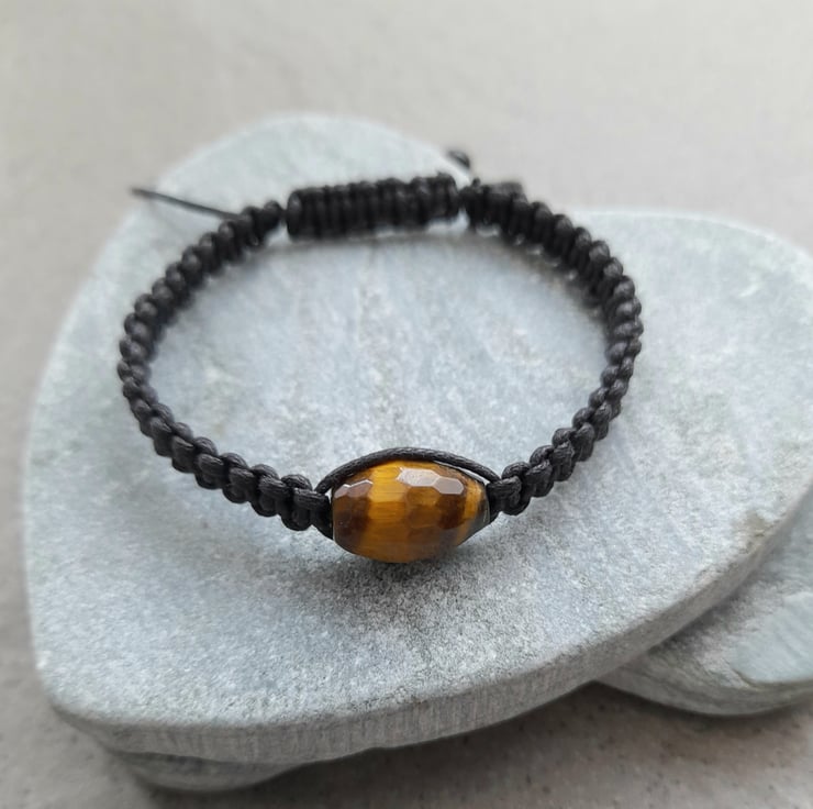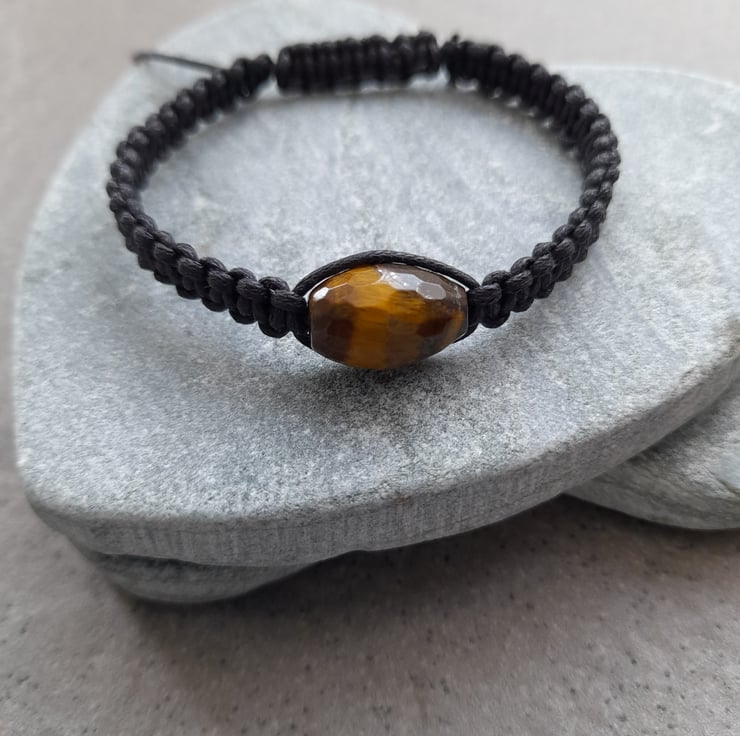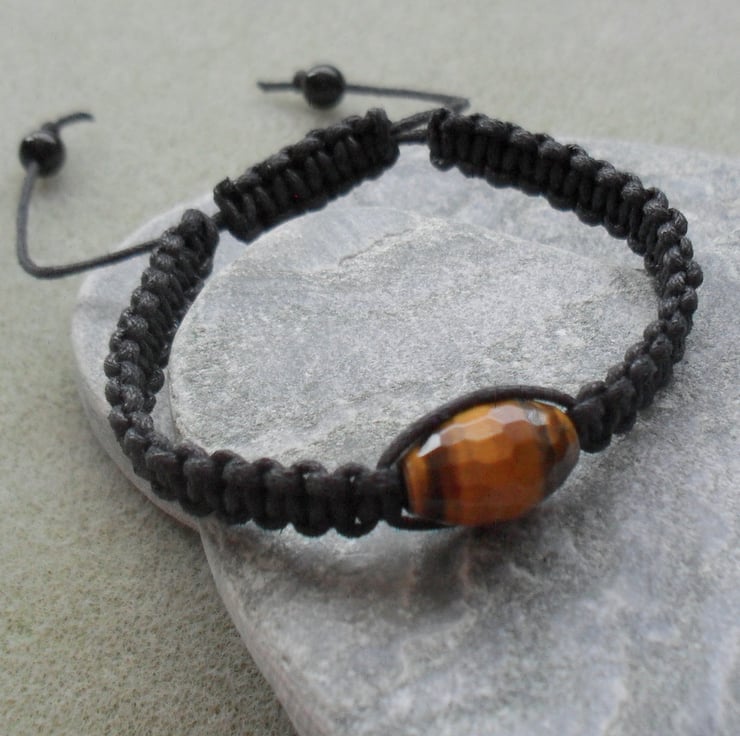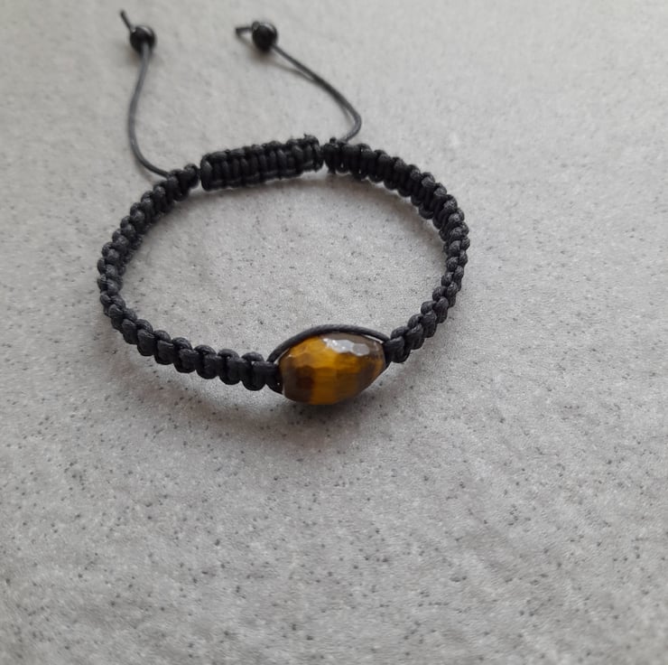 Tigers eye semi precious gemstone macrame knotted bracelet with a black cotton cord and 2 black agate beads.