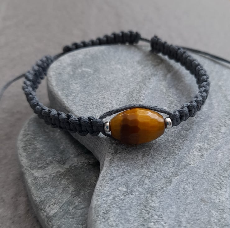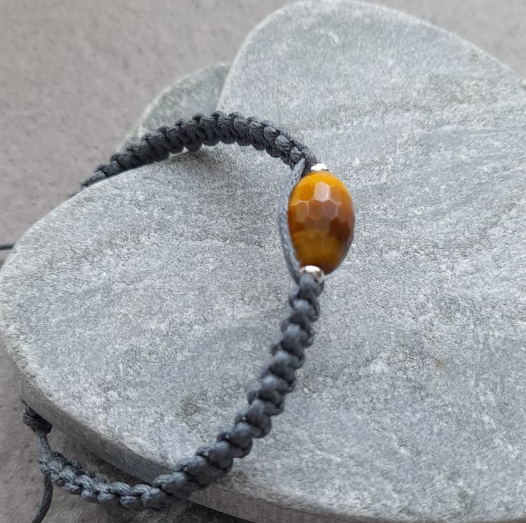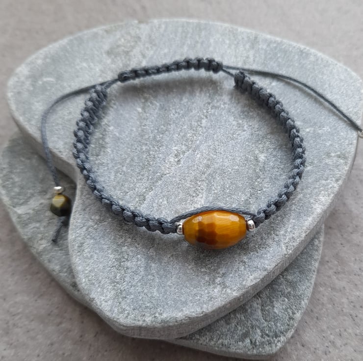 Tigers eye semi precious gemstone macrame knotted bracelet with a grey cotton cord, 4 sterling silver small beads and 2 small faceted tigers eye beads.