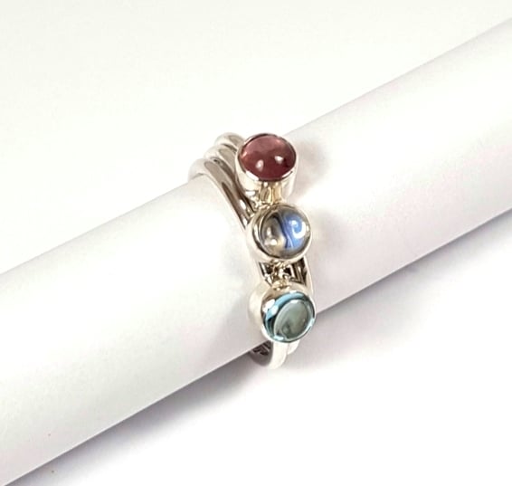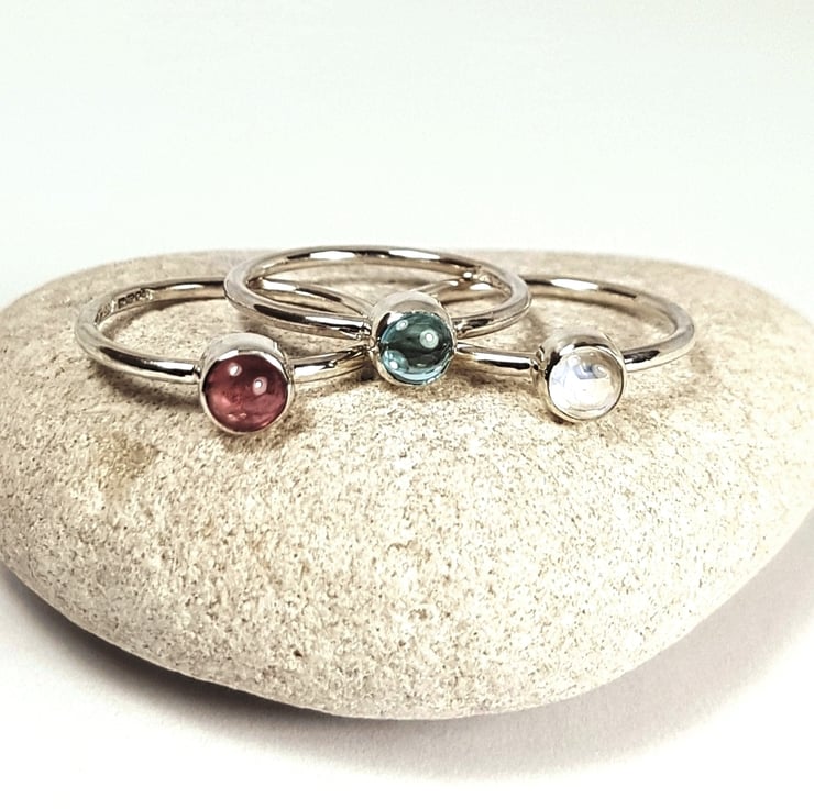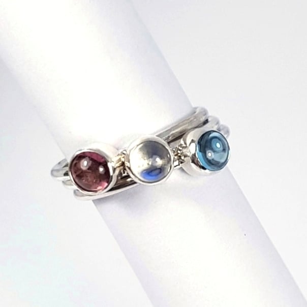 Pretty set of three sterling silver stacking rings that consist of 1.5mm bands set with 5mm Pink Tourmaline, Swiss Blue Topaz and Fine Moonstone. They do look fabulous together but of course can be worn separately or mixed and matched with other pieces. (Please see separate listings for individual rings).
