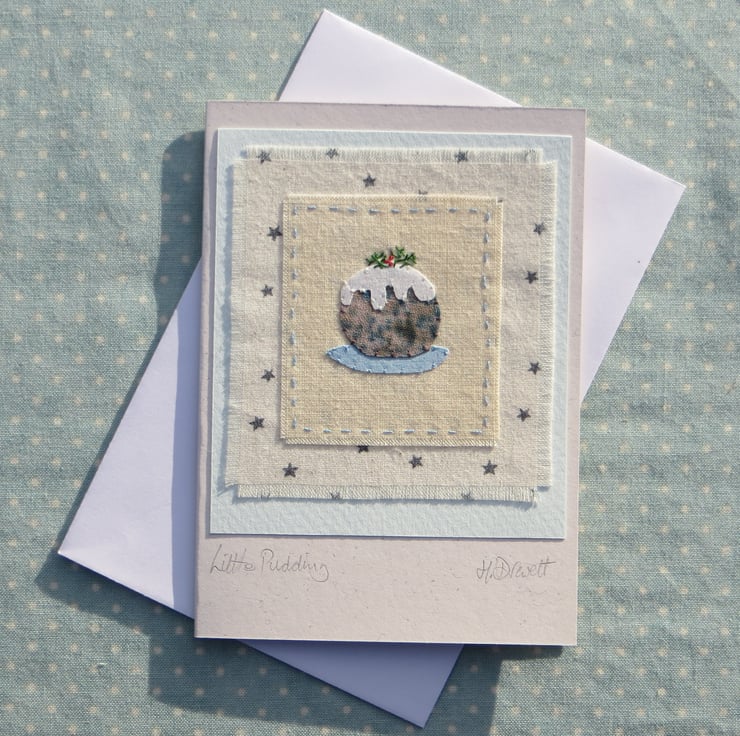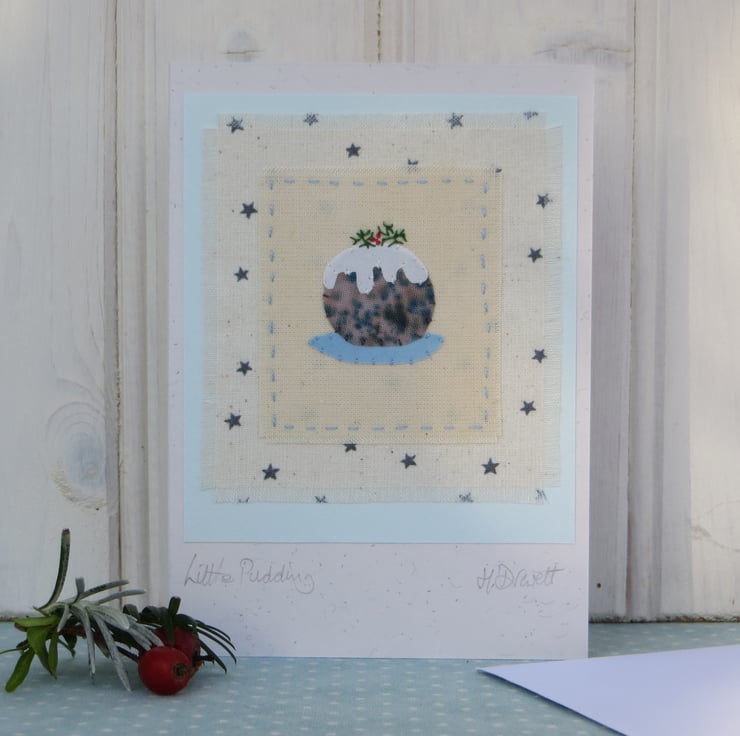 A miniature hand-stitched applique Christmas pudding cut from recycled hand-dyed cotton with intricate embroidered details including holly sprig. Backing fabric is starry print cotton. A special little card to keep.