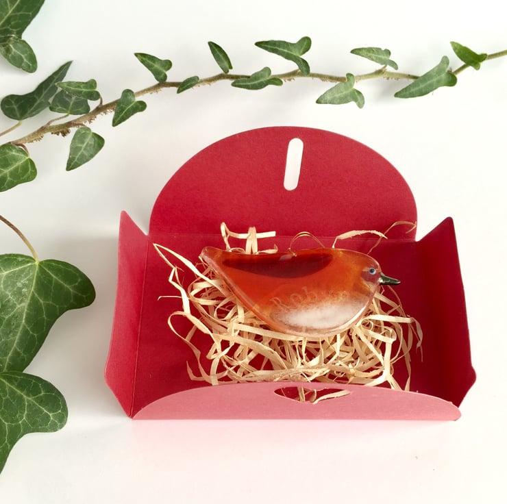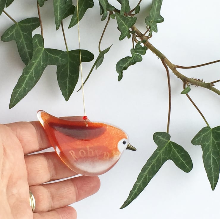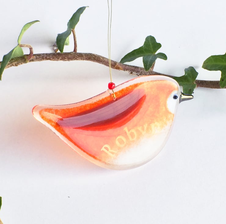This listing is for one small personalised fused glass robin decoration. You can choose a name with up to five letters. The letters are in a SUBTLE and rustic uneven gold tone which catch your eye depending on your angle of view. This lttle fella comes on a length of gold-tone wire with a small red glass bead reminiscent of a red berry and arrives nestled in a little red fold-out box which is closed with the a sticker saying 'Merry Christmas HAND MADE for you with love'. I am supporting a plastic reduced Christmas.