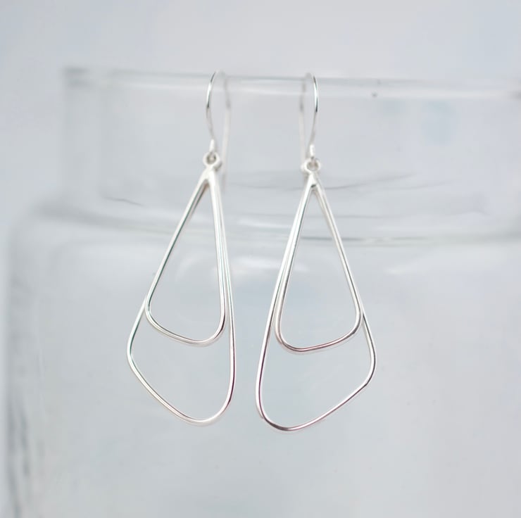 Silver dangle earrings featuring a layered triangular geometric design. Hung from handcrafted ear wires.
