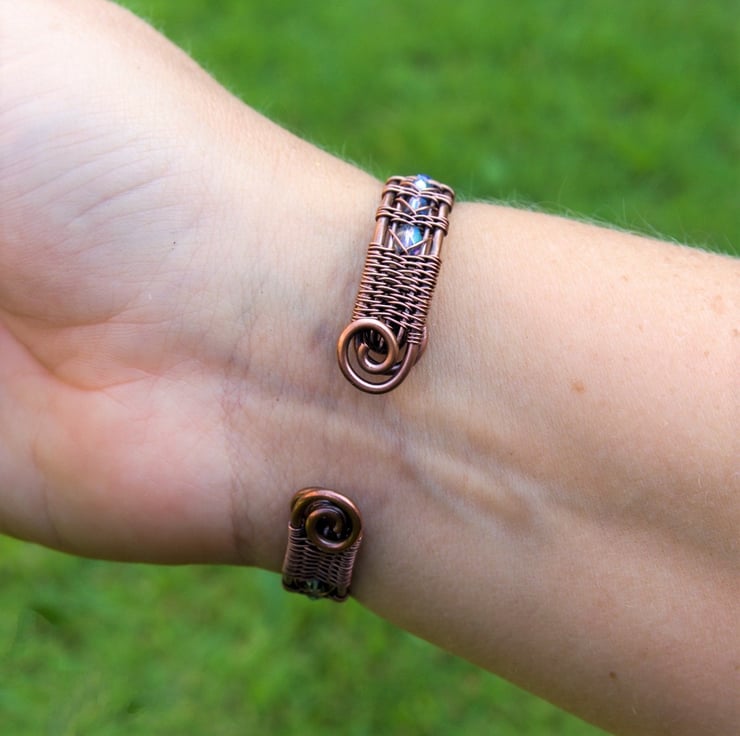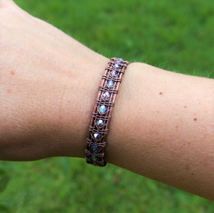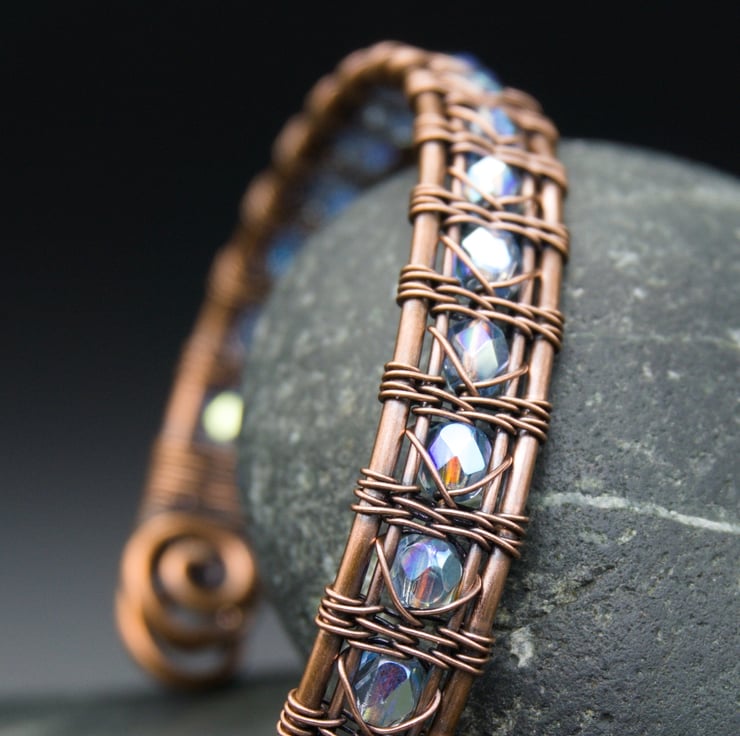 This gorgeous cuff has been woven from copper wire using a variation on the snake weave. I've added pale blue faceted glass beads down the middle of the cuff, each separated by two rows of weaving. The beads have an 'AB' finish - AB actually stands for Aurora Borealis as the finish adds a prismatic effect giving a beautiful mirror shimmer, much like the Northern Lights!