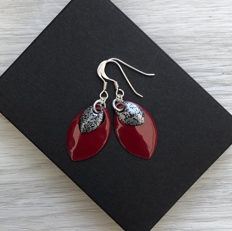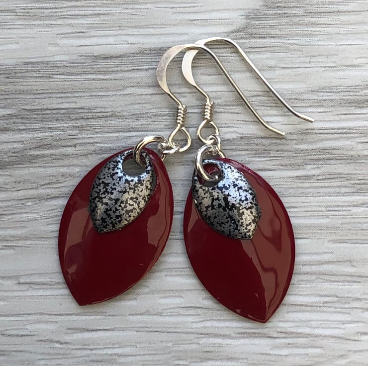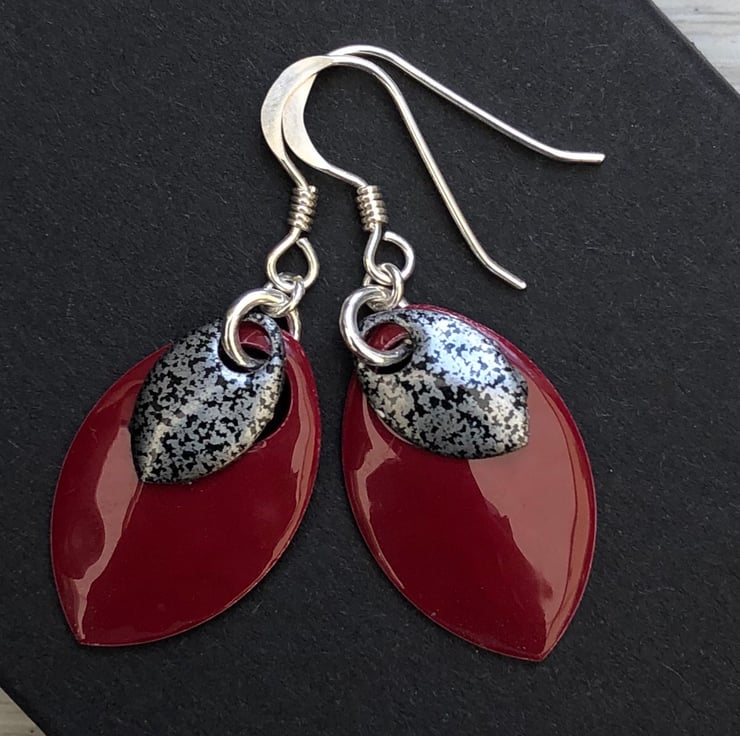 Super light weight aluminium scales in two sizes have been hand enamelled in a number of layers of cold enamel. These hang from sterling silver fish hook earrings using sterling silver jump rings. The back of the scale remains blank, silver in colour.