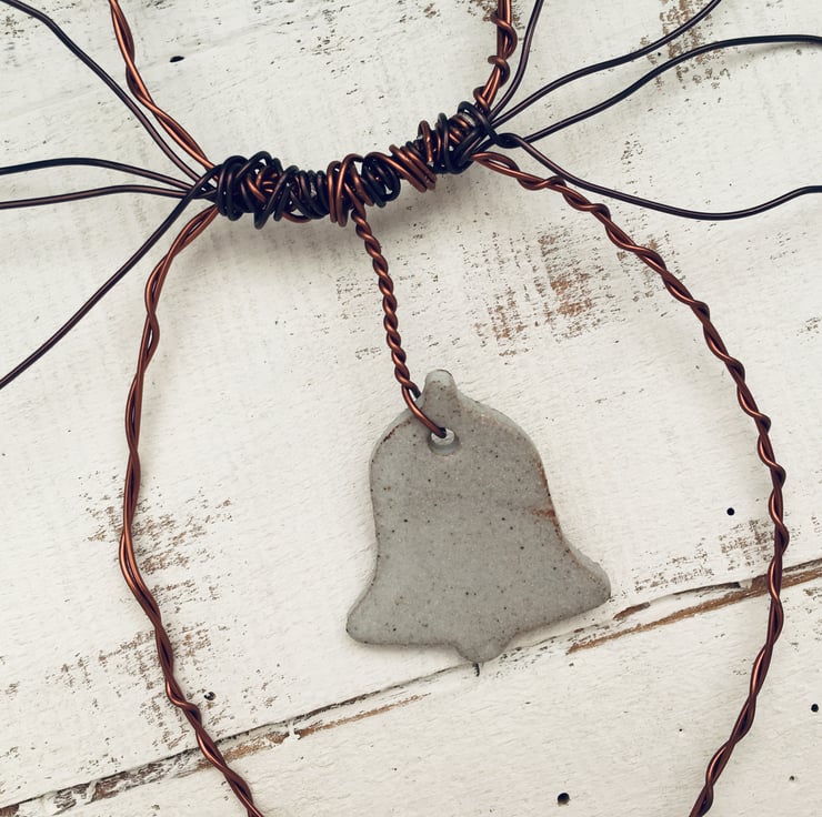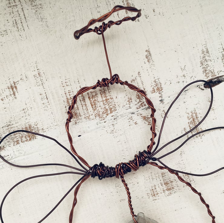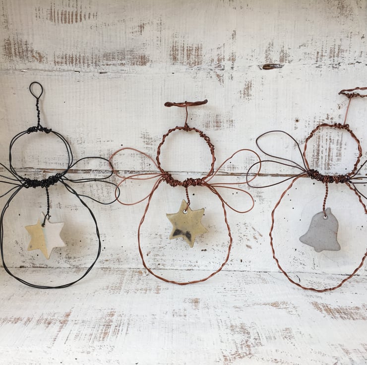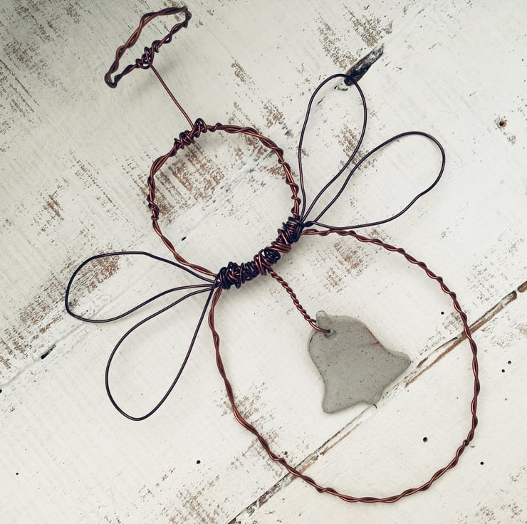 This pretty piece is sculpted from a copper and camel brown wire formed into a Christmas angel design. The Angel can be attached to your Christmas tree using the wire fastened to the bottom of the angel, or hung from the enclosed twine or hung around your home to give a festive feel. I have attached a ceramic Christmas bell onto the centre of the angel.