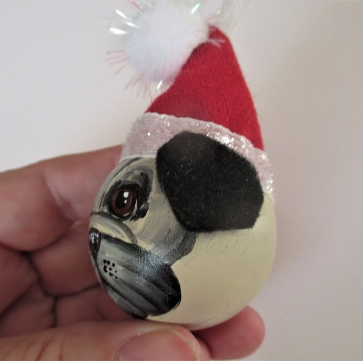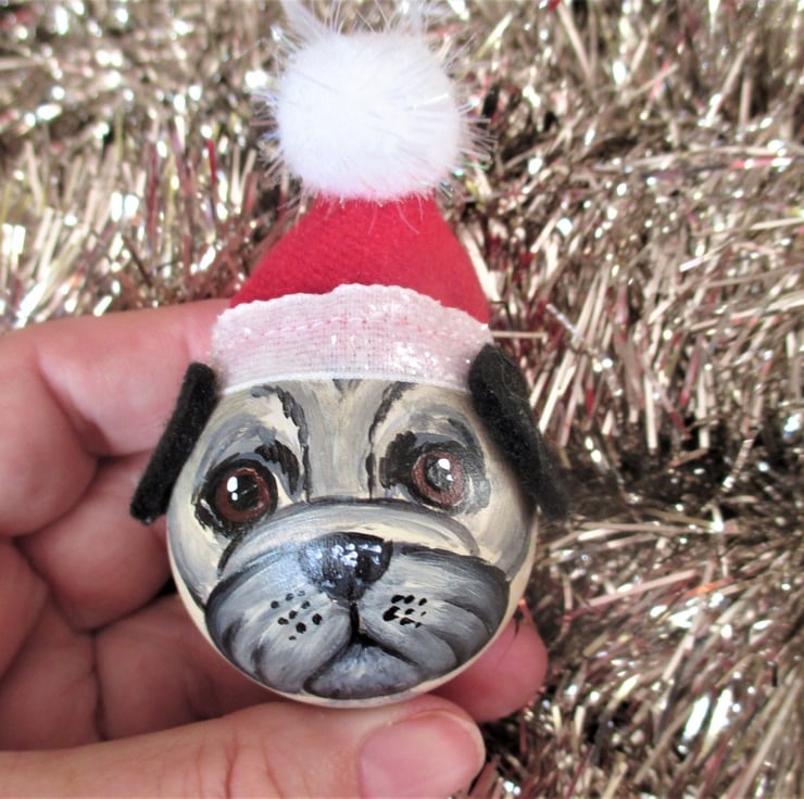 This is a hand painted pug bauble hanging decoration.
