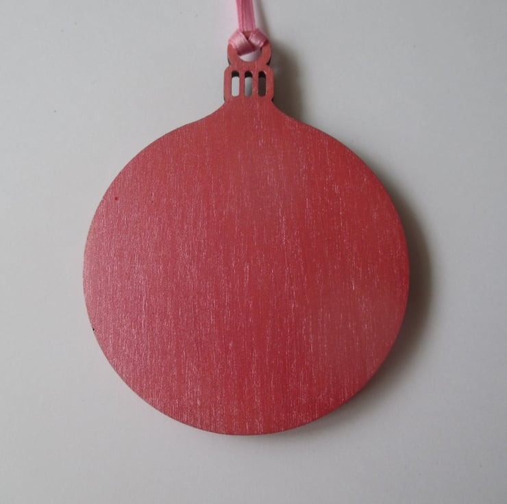 This is a wooden flat bauble shape, painted with a metallic pink paint.