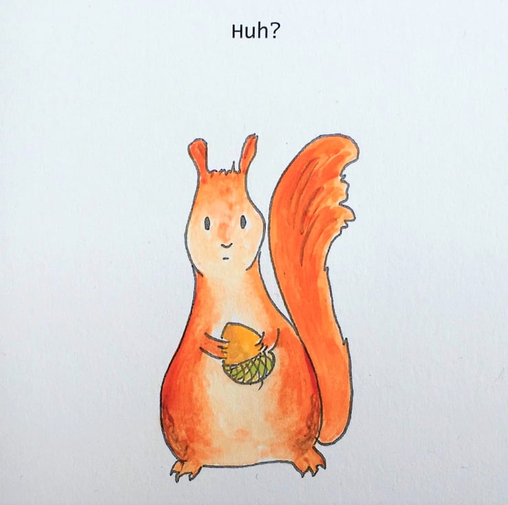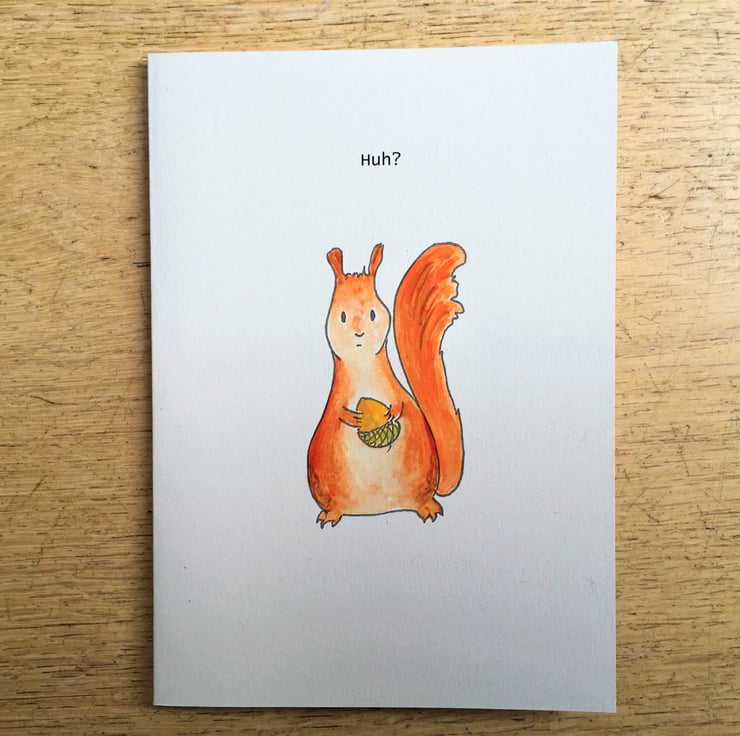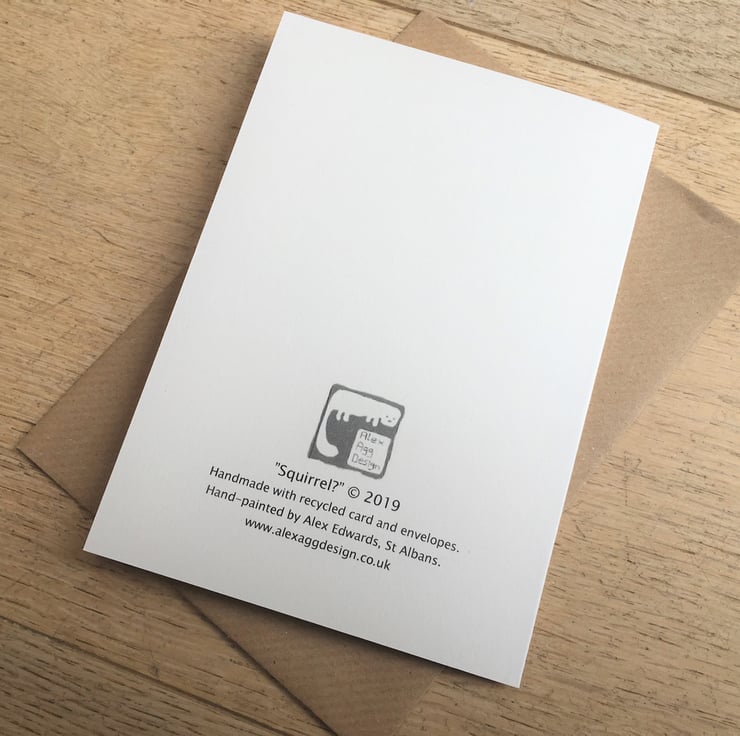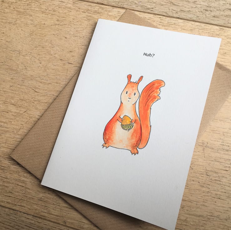 A quizzical squirrel! I loved creating this squirrel card, perfect for Autumn greetings with my own squirrel illustration, hand-painted with care on to recycled card. A fun birthday card or blank handmade card for any occasion. I love to use British Wildlife in my designs and this red squirrel is one on the endangered list and I am aware of impacting the environment and habitat so I use recycled card and envelopes and compostable corn-starch clear sleeves. Love them or hate them, squirrels are full of character!