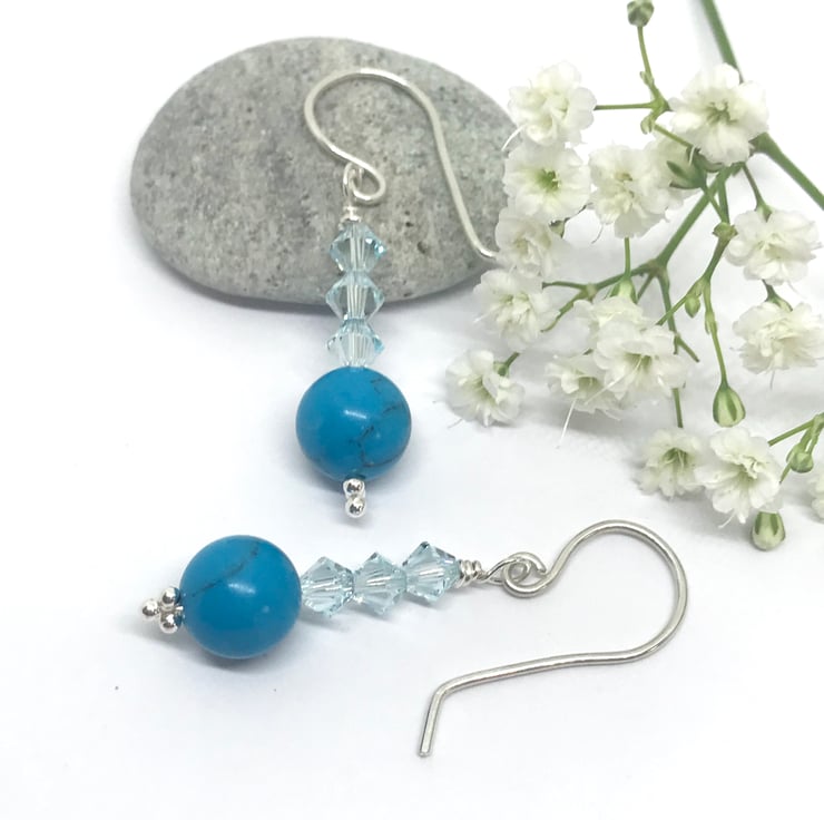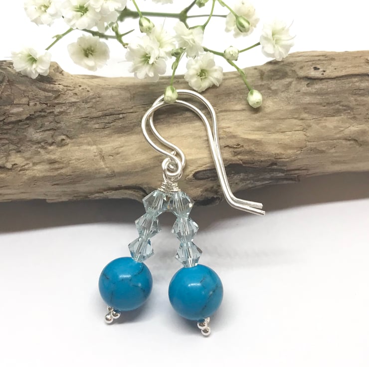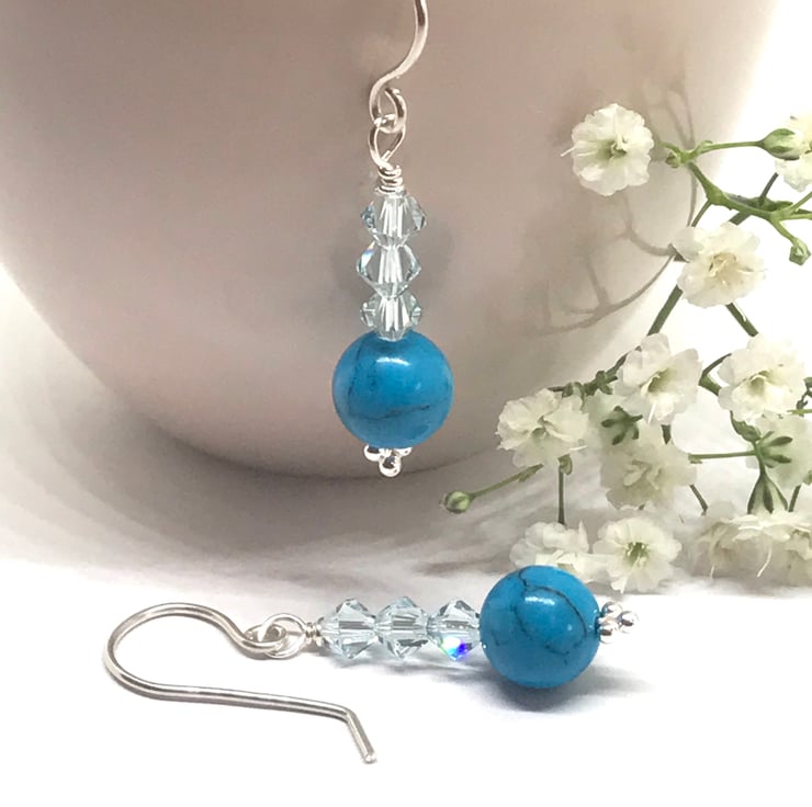 I have selected beautiful turquoise beads and teamed them sparkling bicone crystals in aqua which compliment each other beautifully. Turquoise beads stacked with crystals on a sterling silver three ball headpin and handcrafted sterling silver ear wires.