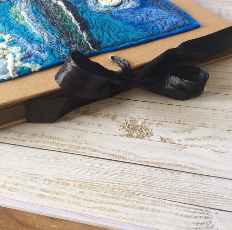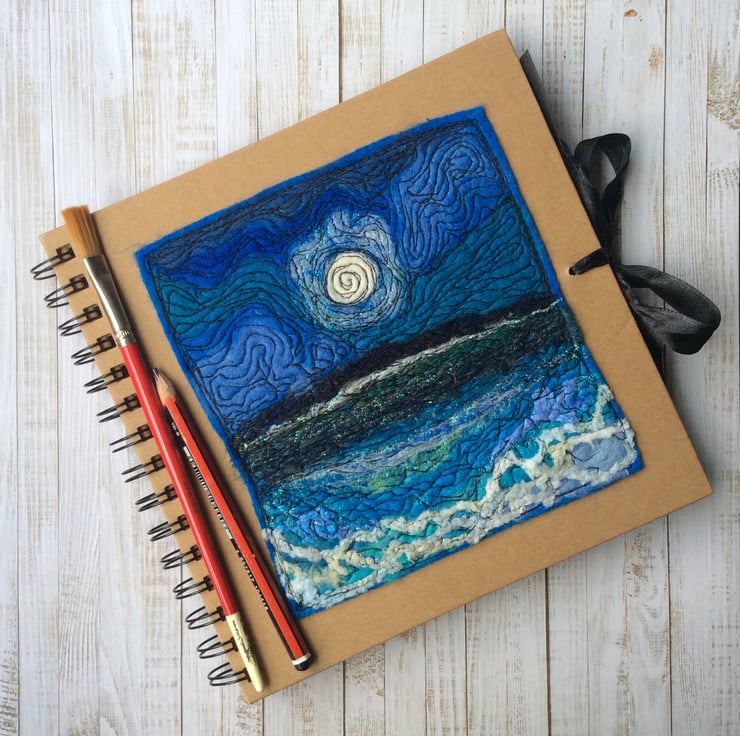 Square Seascape sketchbook with thick brown paper pages and an embroidered card cover. It’s enhanced with an original felting wool free motion embroidery of the sea. It’s ideal for making journaling, painting, scrap booking or drawing. The spiral bound Sketchbook is made with 200gsm brown paper and a heavy brown card cover, measures 19.5 x 19.5cm, contains 60 pages (120 sides. The cover is held closed by a black ribbon to keep contents safe and tidy. The artwork measures 16 x 15 cm.