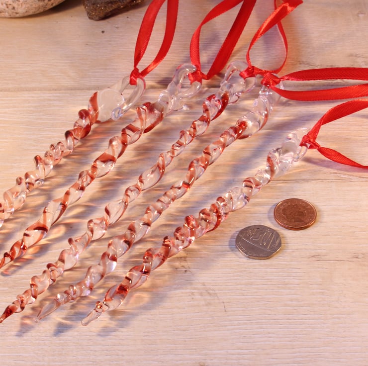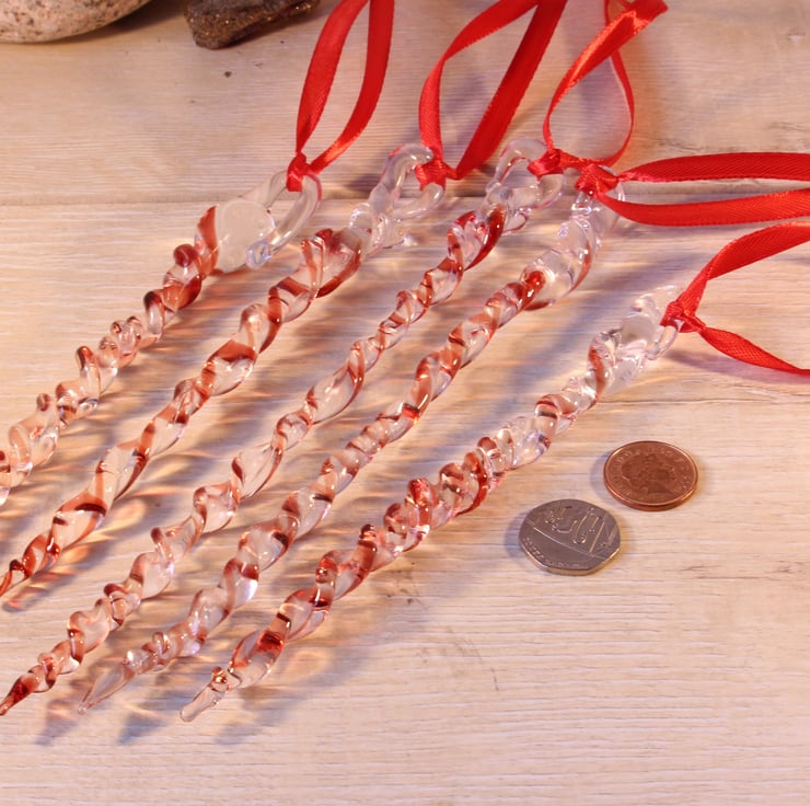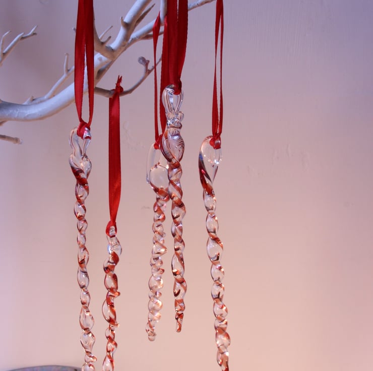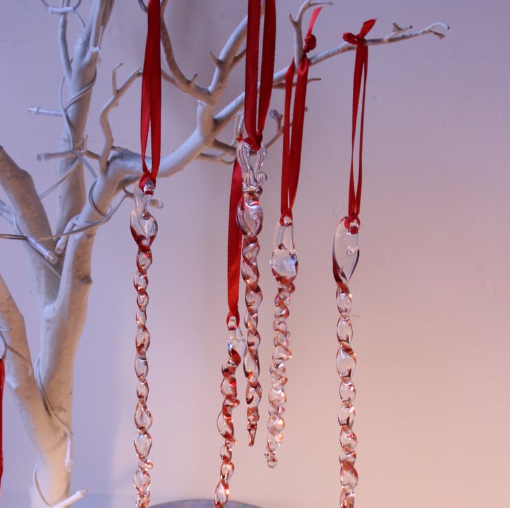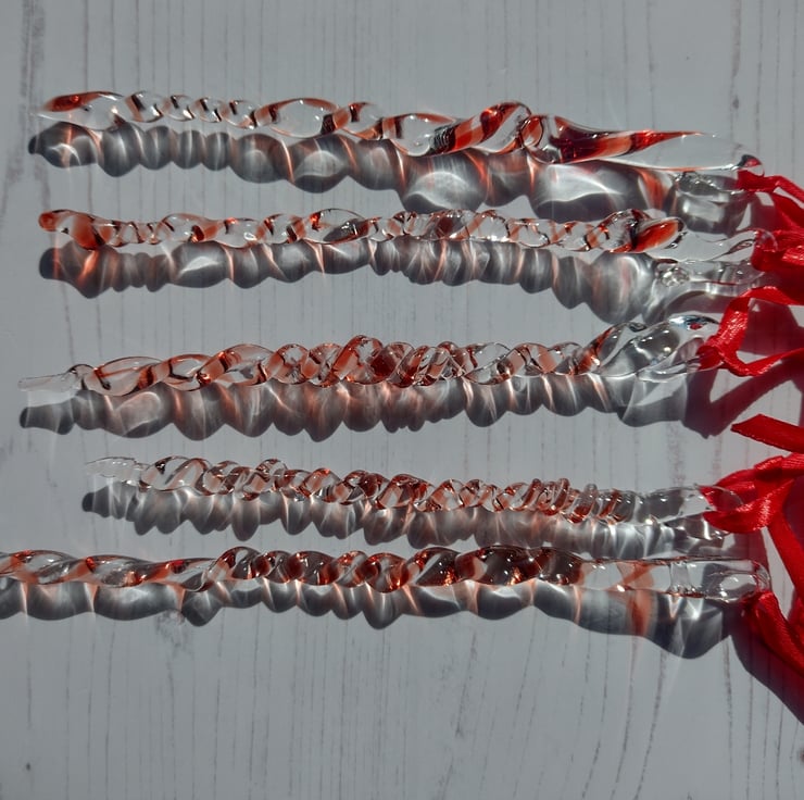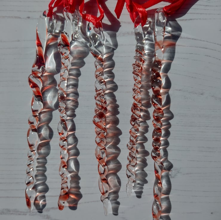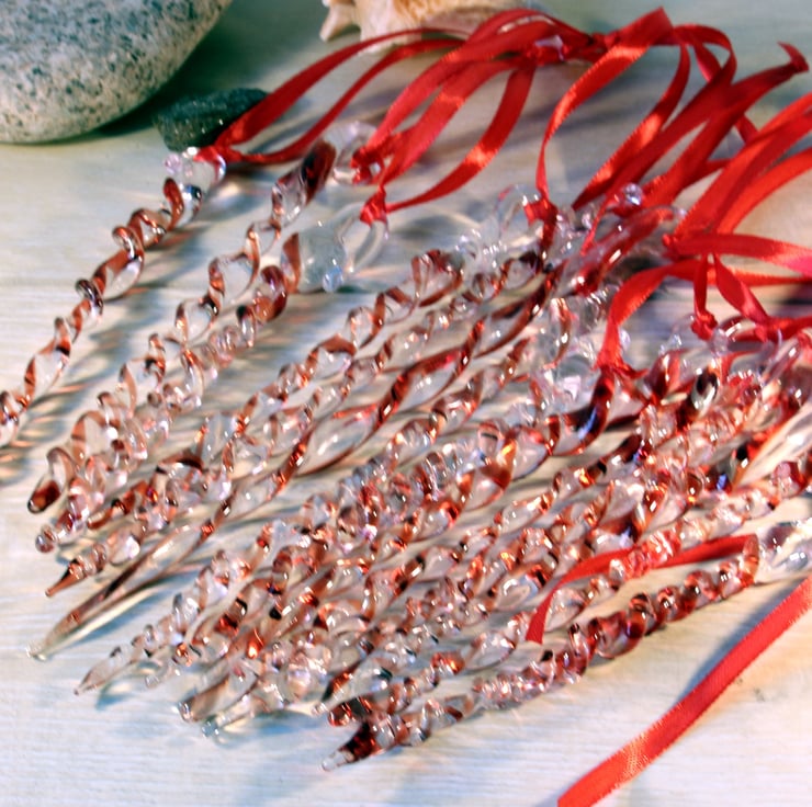 These begin life as glass rods, which I melt with the flame of my lampwork torch, and decorate with another colour. The molten glass is manipulated swirled, twisted and stretched in the flame, and then placed into the kiln to anneal. Each icicle is different and vary in length and diameter ( in reality I get into a zone when making these, and they always end up with differing numbers of twists and different lengths) - but then you'll never get two identical icicles in nature either!