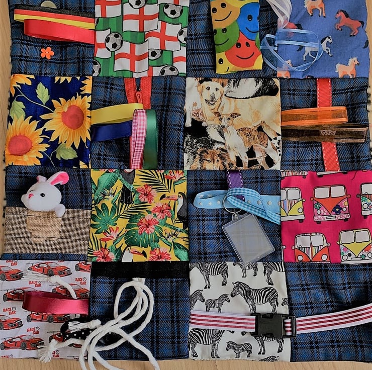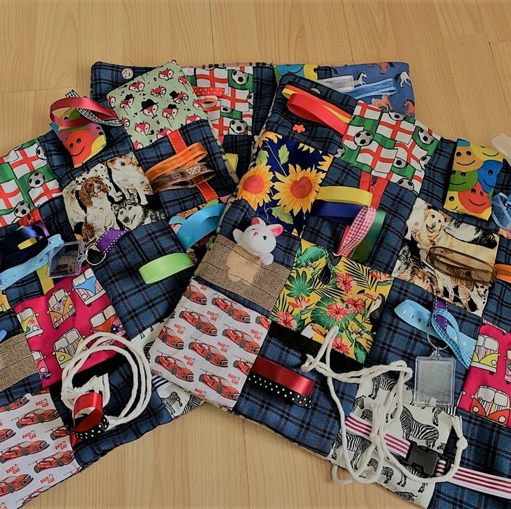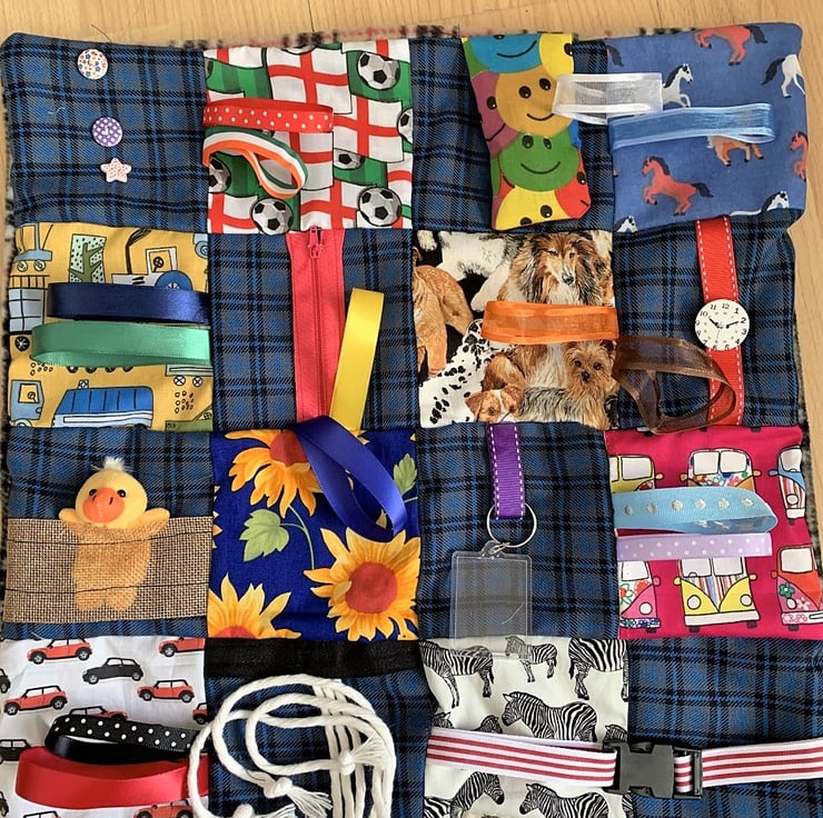 My dementia fidget blankets are made with love , and no two are alike. These fidget blankets are very helpful for maintaining fine motor skills and encouraging activities of daily living such as using buttons, zippers, laces, , etc. In addition, the fabric prints can evoke fond memories, the activities keep restless minds and fingers busy, and the various fabrics, ribbons beads and bells and squeakers which all stimulate
