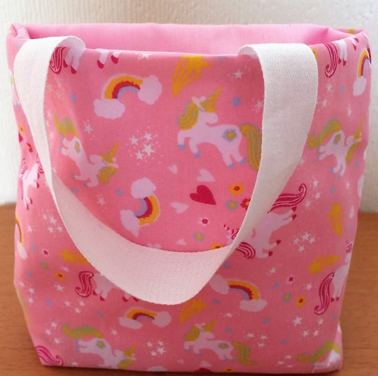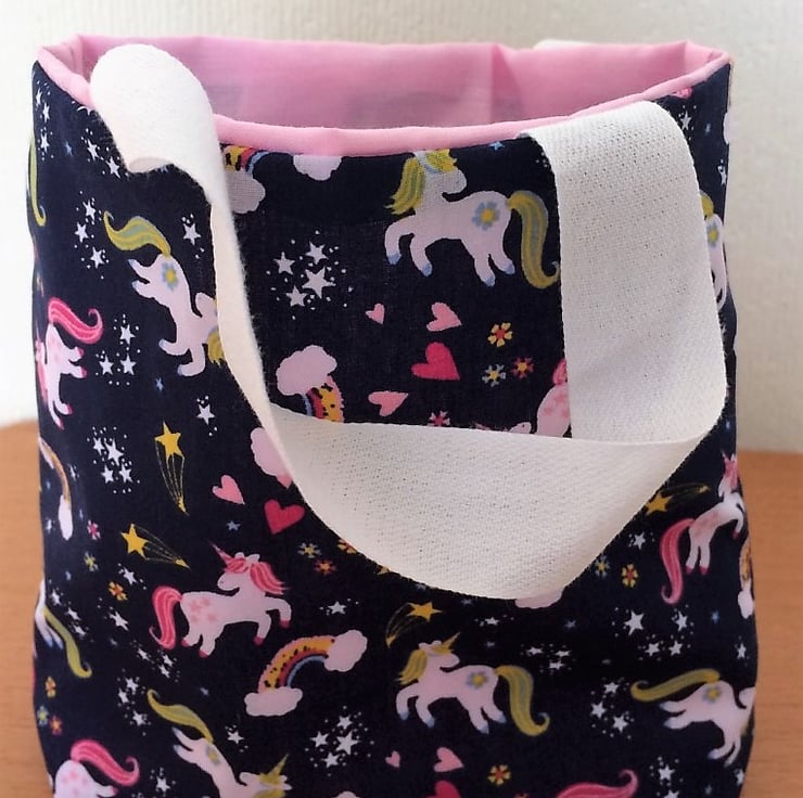 Unicorn Party gift bags made in a lovely cotton Unicorn print in Pink and Navy lined with a pink cotton with white cotton tape handles.
