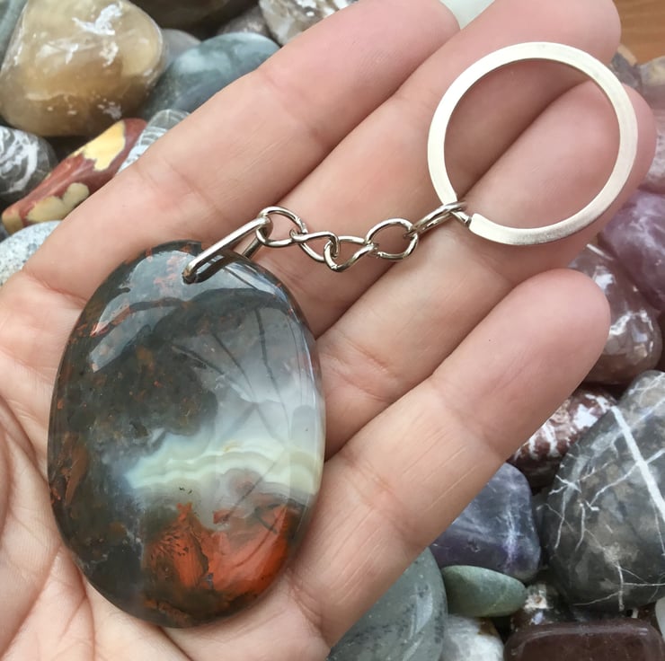 Amazing and substantial Oval Pigeon Blood Jasper Gemstone keyring. A Beautiful and unusual Jasper Gemstone Keyring with silvertone Findings. Could be used as a handbag charm.