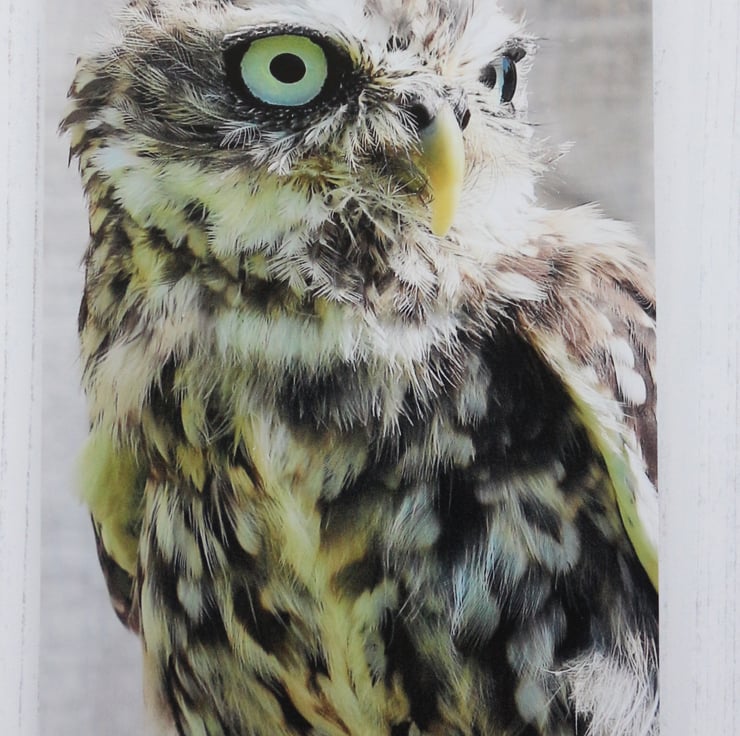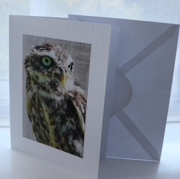 6" x 4" photo mounted on a white textured card, with a blank inner, of a Little Owl at the open day of the Secret World Wildlife Rescue Center; West Huntspill, Somerset. An envelope is included.