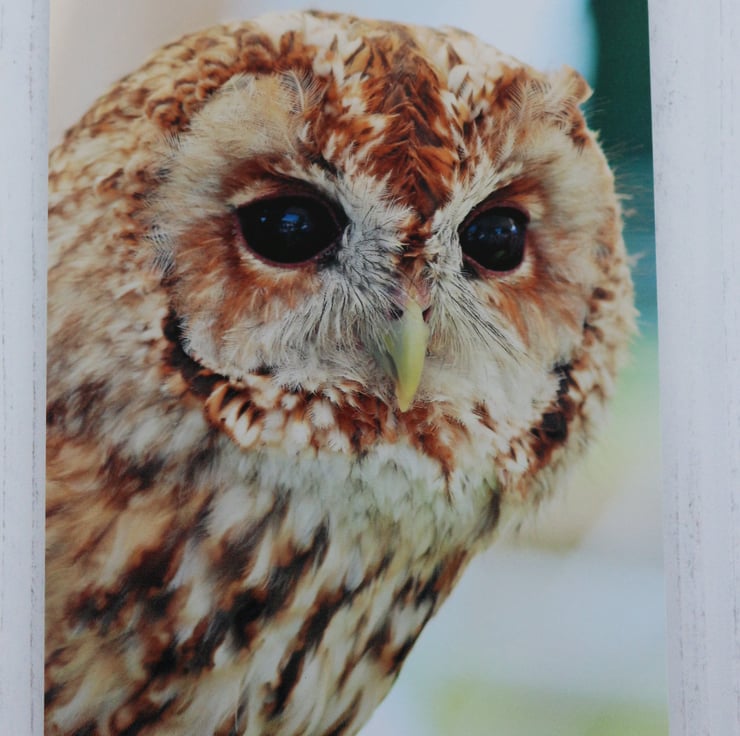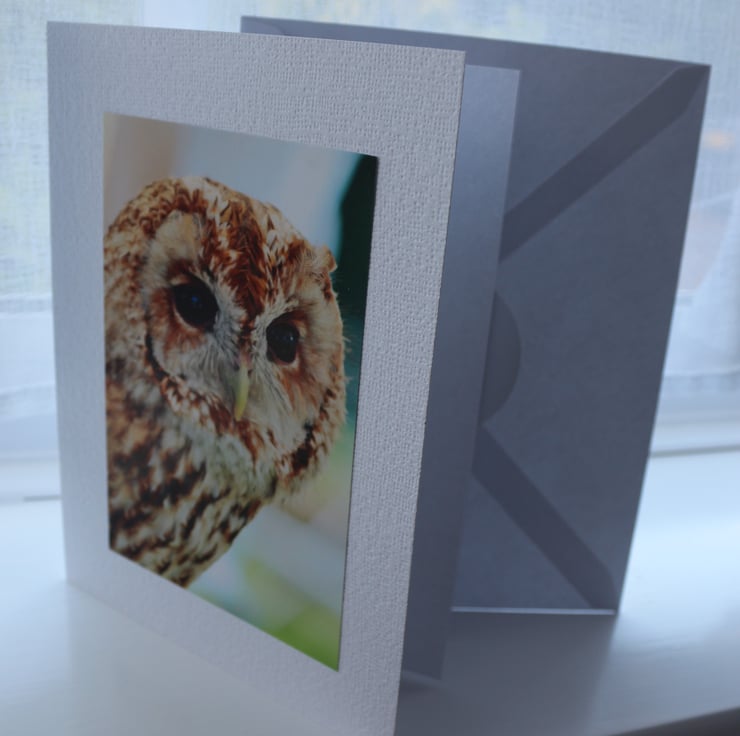 6" x 4" photo of a Tawny Owl, mounted on a white textured card, with a blank inner, & an envelope is included. It comes with either a 10cm.sq. coaster or a slightly smaller fridge magnet. The photo was taken at the Secret World Wildlife Rescue Centre, at East Huntspill, Somerset. Please let me know which you require.