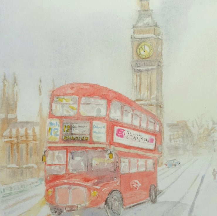 A professionally produced blank greetings card from my original watercolour "Westminster Winter" of a classic Routemaster RM London bus. I have placed it in a wintry scene on Westminster Bridge, with Big Ben and the Houses of Parliament in the background.