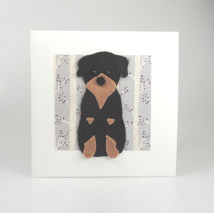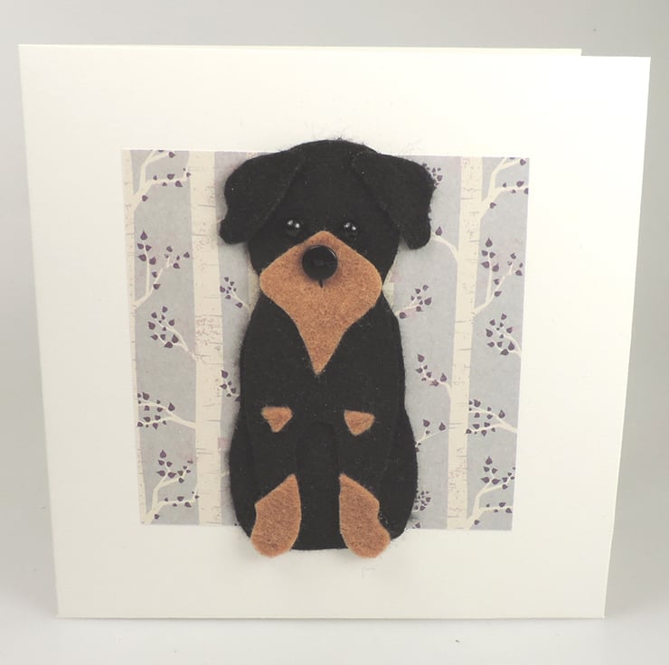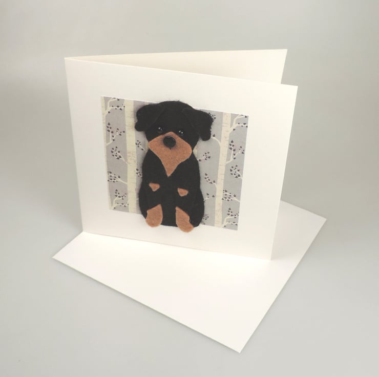 Felt Rottweiler dog, with button nose and eyes, on the front of an ivory 15 x 15cm square card. Inside has been left blank for your own message or greeting.
