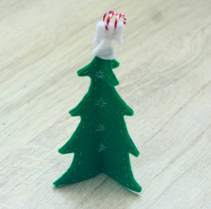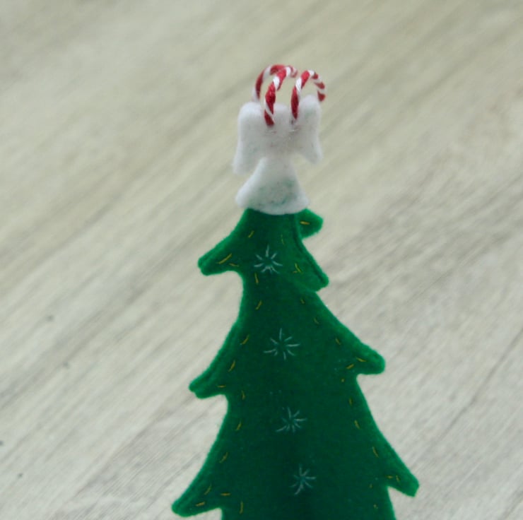 The Trees are cut from glittery green coloured wool blend felt and the stars/angels at the top are cut from white glittery felt. They have been embroidered using gold and white embroidery thread to add a touch of sparkle. The trees are hand stitched using a straight stitch around the edge.