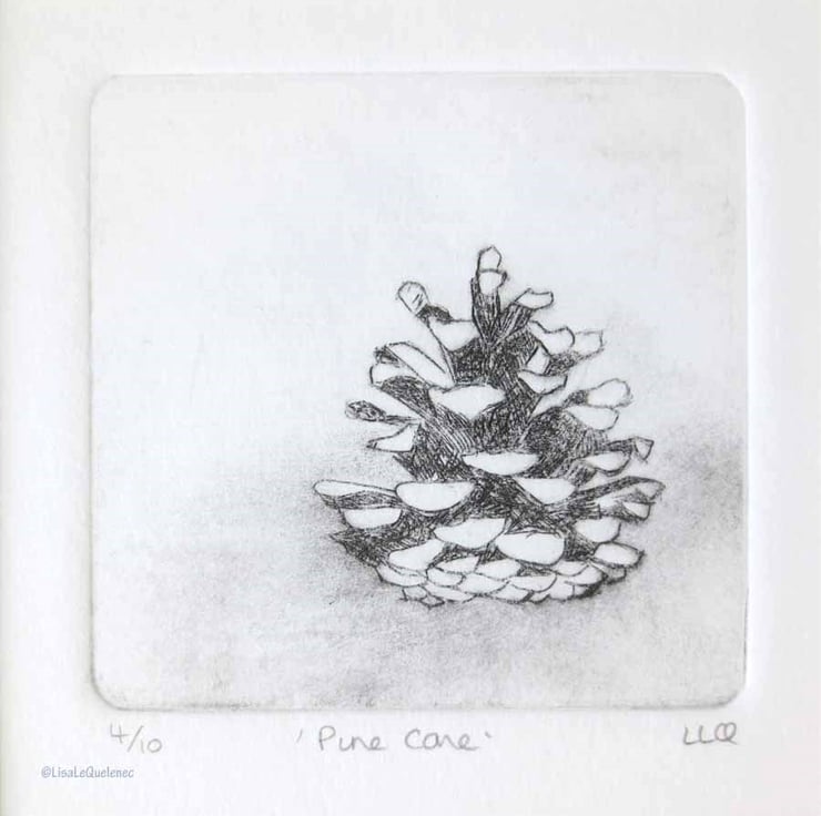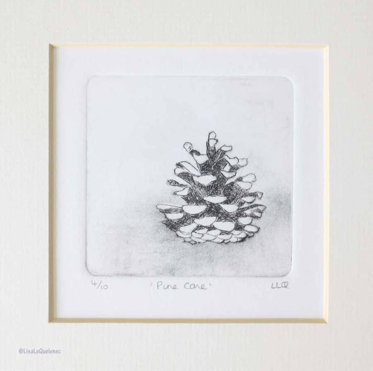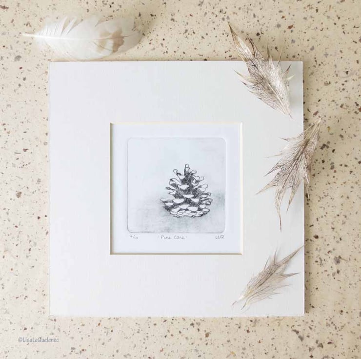 Original drypoint etching print of a pinecone printed in black ink. Image size 7.5x8cm ( approx 2.75x3inch) and comes mounted/matted to fit a 20.5x20.5cm (approx8x8inch) frame.