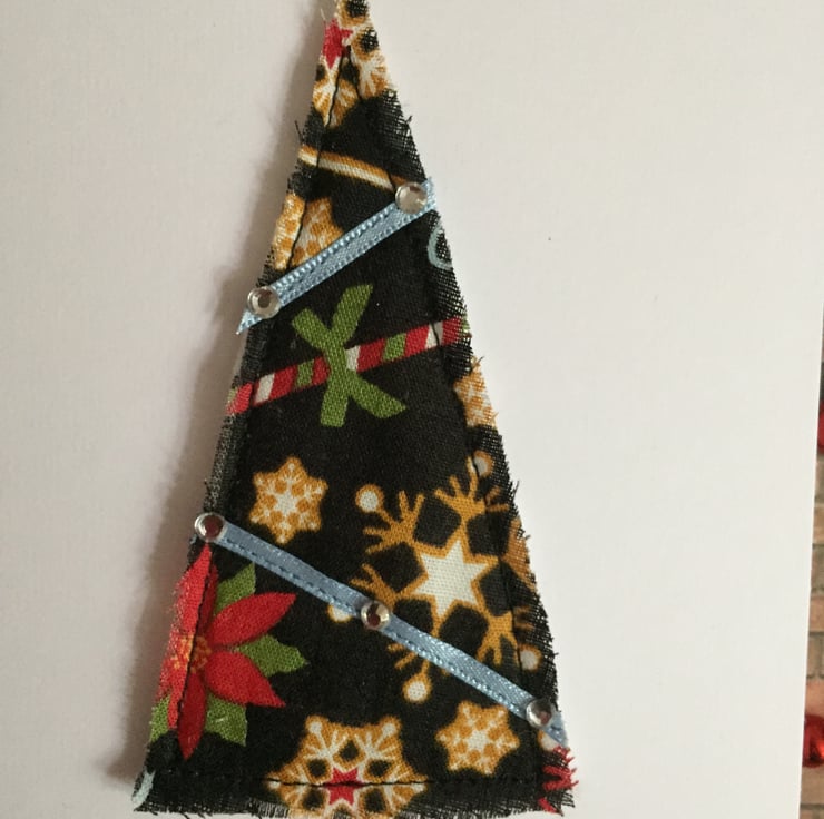 Christmas tree card depicting a pretty candy cane and stars cotton fabric Christmas tree which has been sewn onto felt and has pale blue satin ribbon, with adhesive gems, stitched across it.
