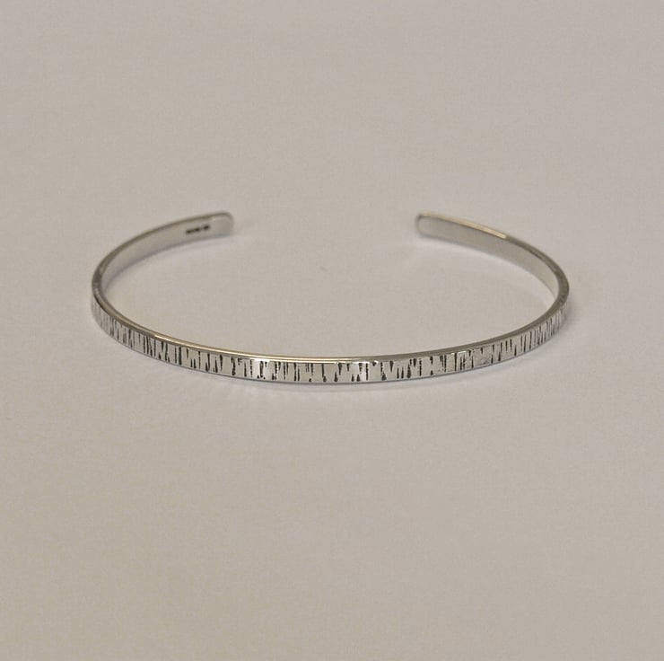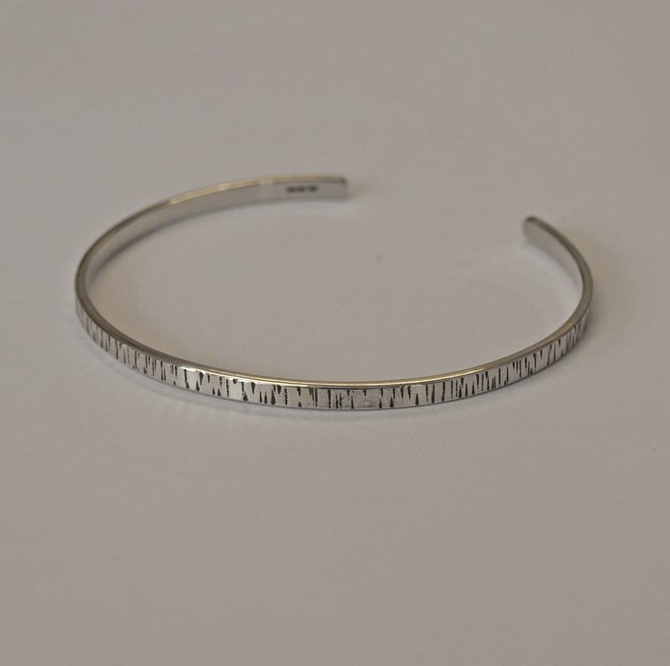 This silver birch tree bark inspired cuff bracelet has been handmade from solid recycled sterling silver. The texture has been created by hammering the surface with the sharp end of a hammer.