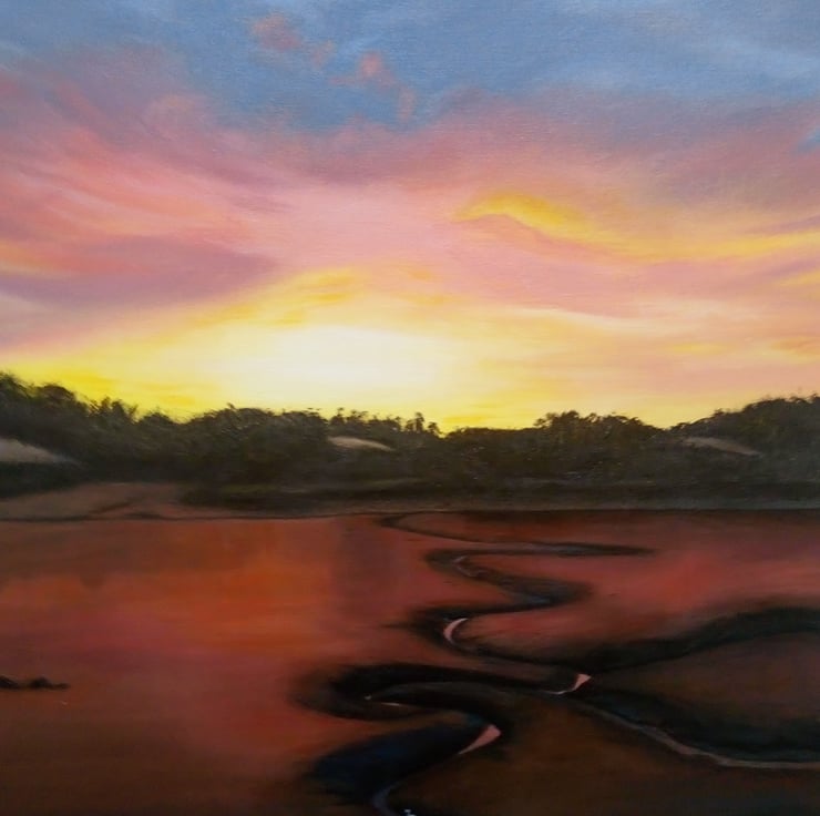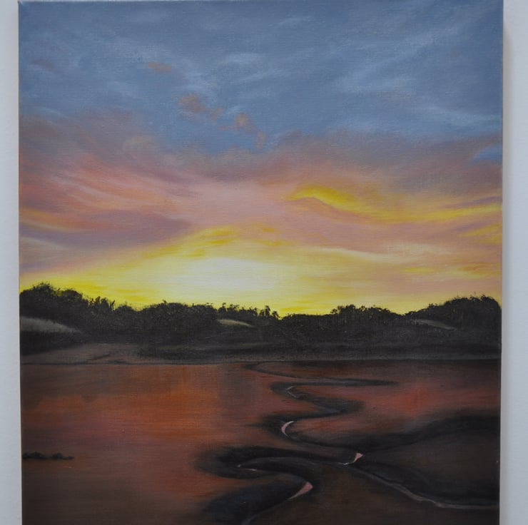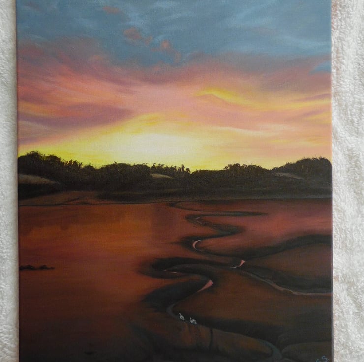 Painting of sunrise at Saltash in Plymouth with the tide out with two little swans walking up the river. My friend took a picture when she stayed with her boyfriend and it was so amazing that I had to paint it.