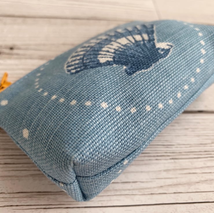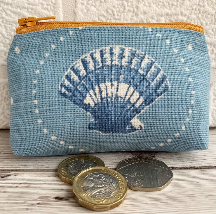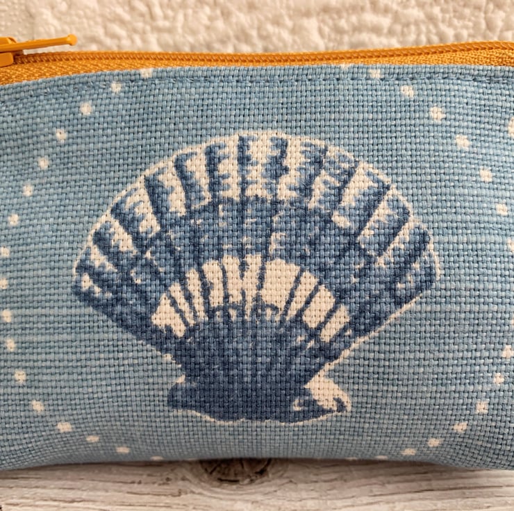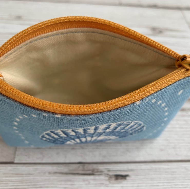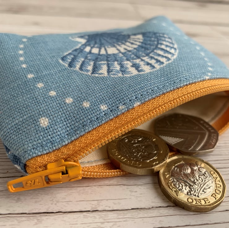 A lovely small coin purse with a seashell pattern. The pattern features a blue and white scallop shaped seashell on a blue background with scattered white spots. The shell is surrounded by a ring of white polka dots. For the zip, I've used a golden yellow colour which contrasts with the blue fabric and adds to the beach theme. The coin purse is lined with cream fabric and the base of the purse is boxed to give more space inside.