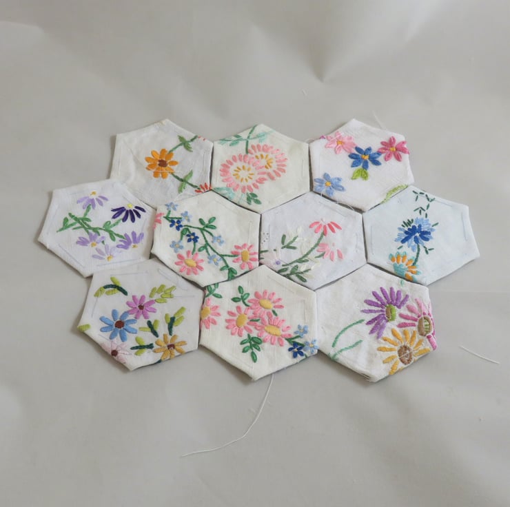 Ten floral themed, traditional, hexagons for patchwork - cut from vintage embroidered linens and tacked ready for use. The vintage linens used have been carefully chosen, laundered, pressed, cut and tacked to offer you a pleasing selection ready for you to create an item of your choice. Purchase more than one pack, combine them with a pack of hexagons from printed fabrics, listed separately, or combine them with patches cut from your own fabric, to create a cushion cover, tote bag, the beginnings of a quilt ...........