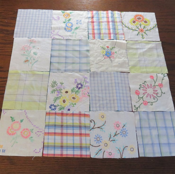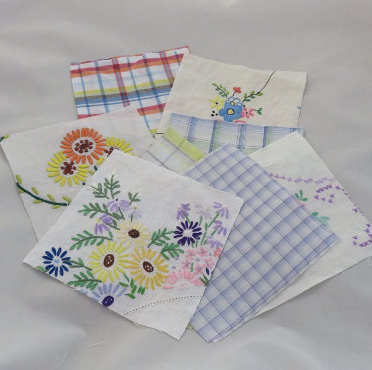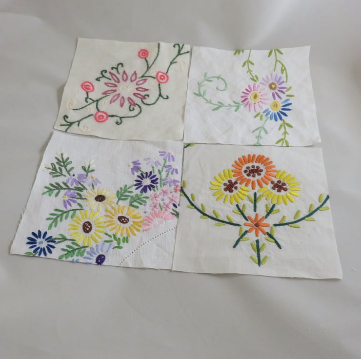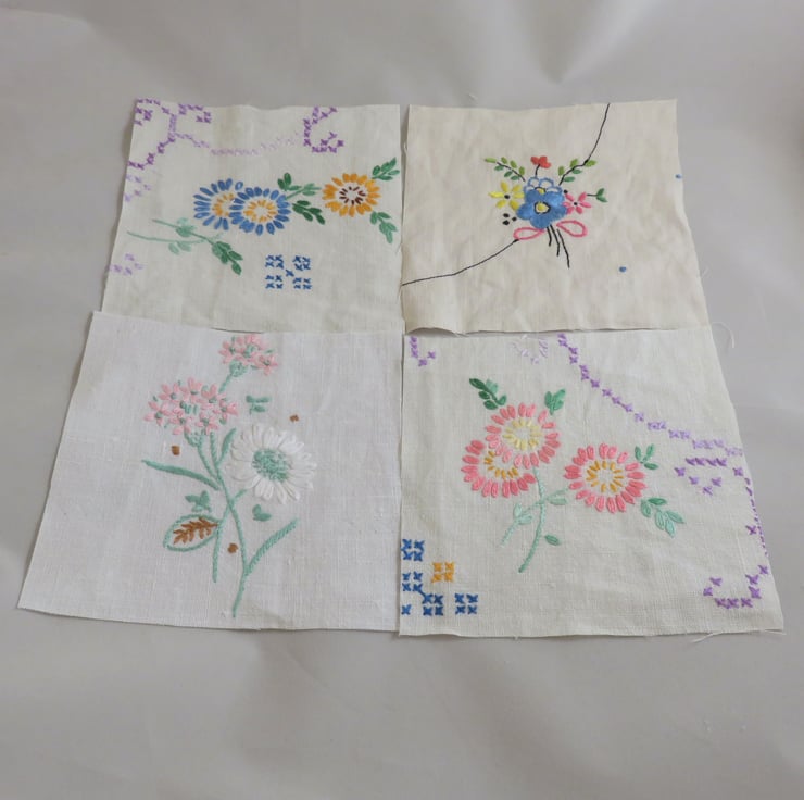 Eight floral themed patchwork squares cut from vintage, embroidered linens.