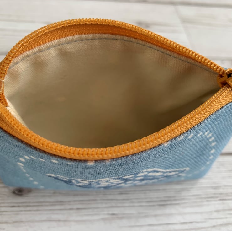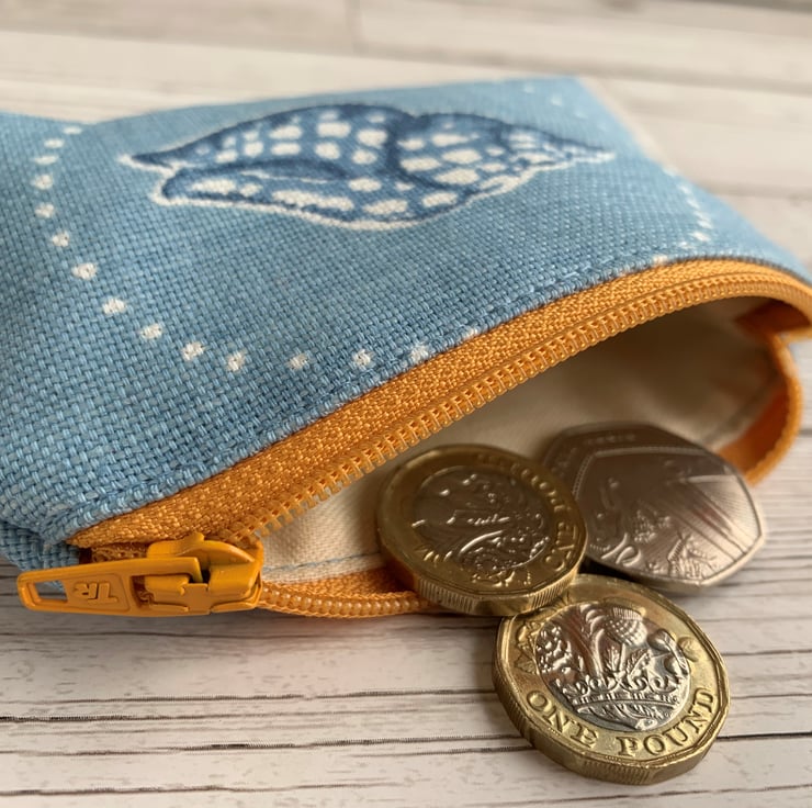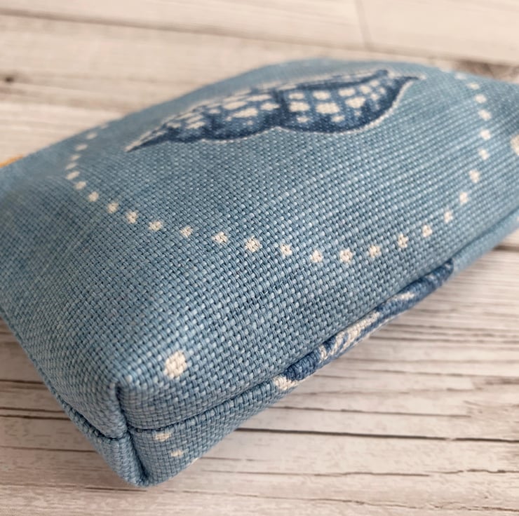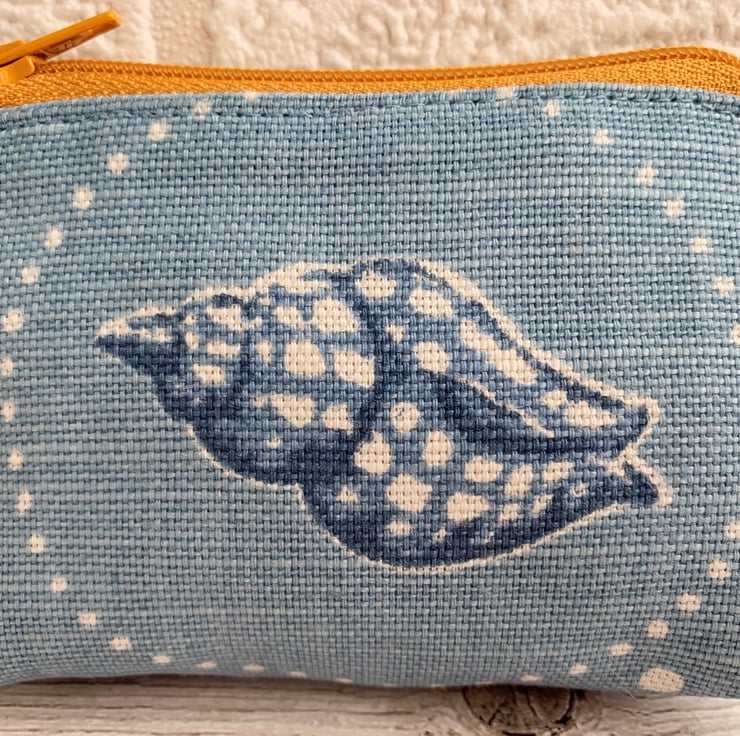 A beach themed small coin purse featuring a seashell pattern. The pattern depicts a blue and white whelk shaped seashell on a blue background with scattered white spots. The shell is surrounded by a ring of white polka dots. I've added a golden yellow zip which contrasts with the blue fabric and adds to the beach theme. The coin purse is lined with cream fabric and the base of the purse is boxed to give more space inside.