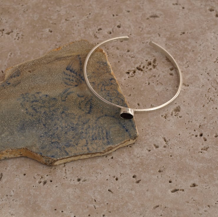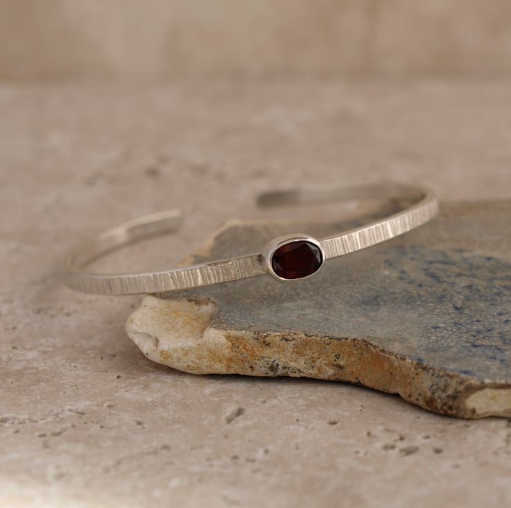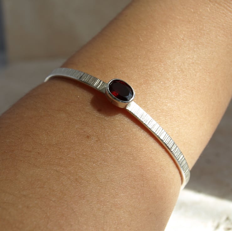 A beautiful faceted oval garnet has been set in a handmade solid sterling silver cuff bracelet with a line detail texture created by the sharp edge of a hammer.