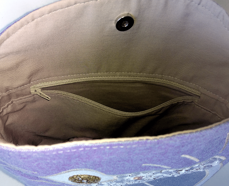 As said, the main fabric is blue, though it is a little difficult to describe the actual shade of blue as it is woven using two coloured threads, turquoise and purple. The resulting colour is subtle and pleasing. The lining is plain beige.