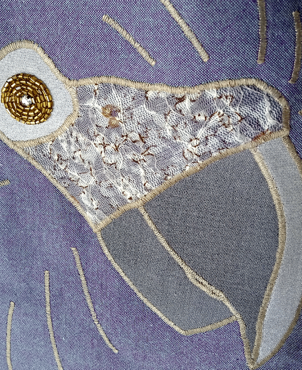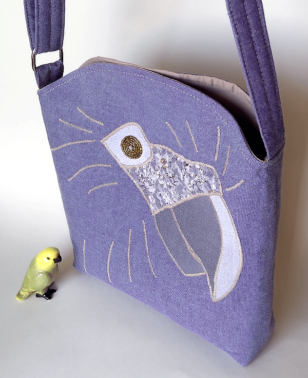 My love of birds, parrots in particular, inspired me to design this bag. The main colour of this bag is a subtle blue and is inspired by baby Spix macaws, with the white stripe down the centre of its beak. Lace has been used above the beak and a little sparkle is incorporated into the eye, by using a crystal bead surrounded by brown sequins. To resemble the head of a parrot, the top of this bag is curved. The macaw features are appliquéd on the front of the bag only.