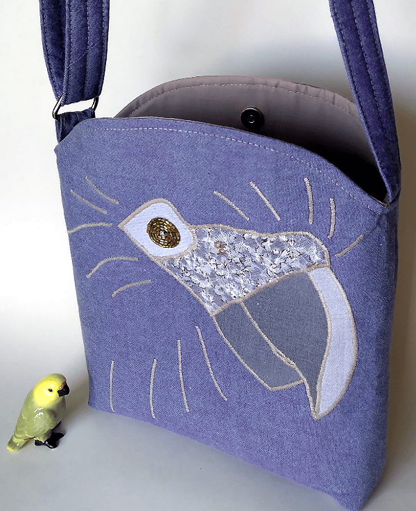 My love of birds, parrots in particular, inspired me to design this bag. Spix's macaw, also known as the little blue macaw, is a macaw native to Brazil. The main character in the animated film, Rio, is based on a Spix macaw. I understand they are currently extinct in the wild but there is a programme to reintroduce them.