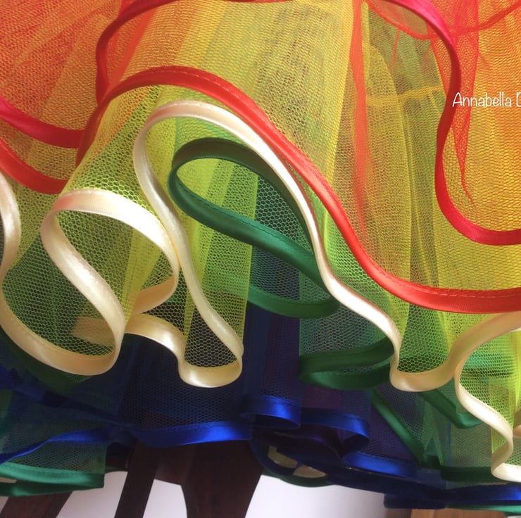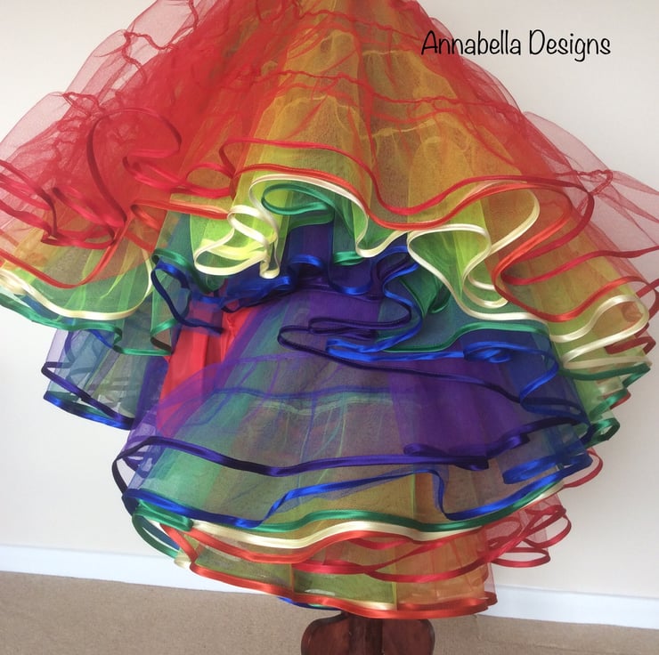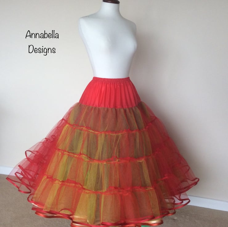 Beatiful custom made stiff net 6 layer petticoat satin bound in matching colours on layers, elasticated waist, fully lined to stop net scratching legs.A beautifully designed bespoke petticoat designed by me and individually made with care and attention to detail.