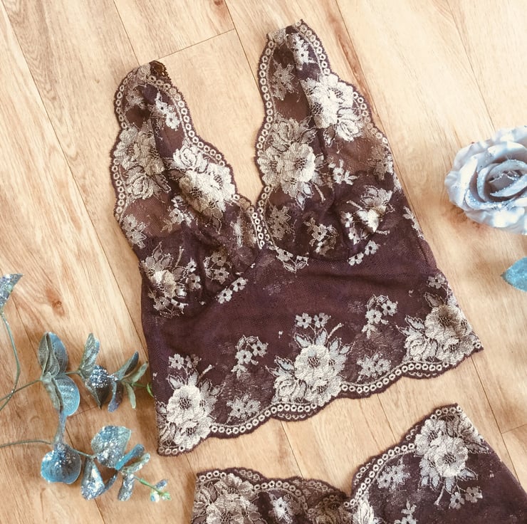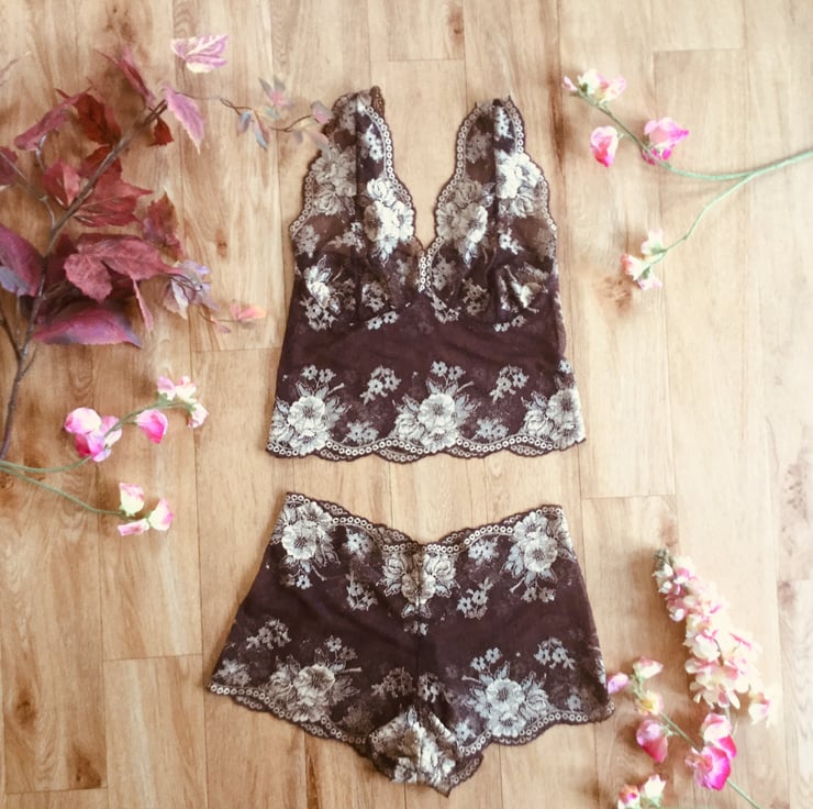 Rich cocoa and gold camisole bralette , made from deliciously decadent semi sheer stretch lace.