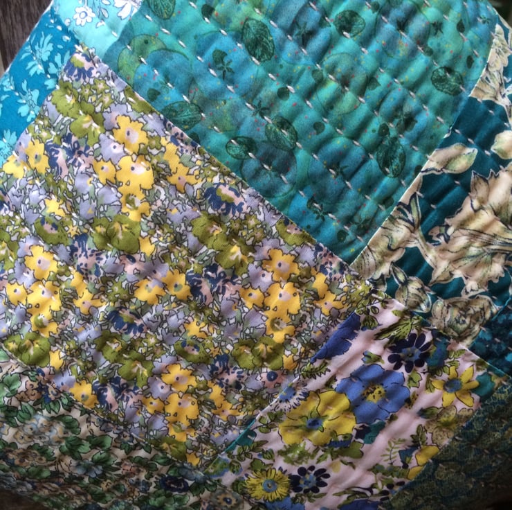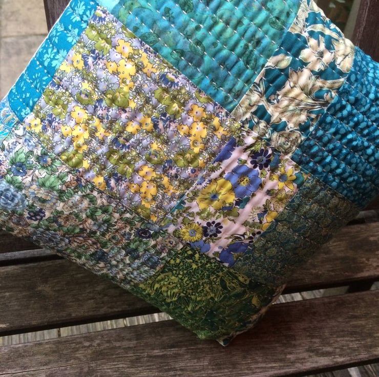 Beautiful scraps of Liberty fabric make a wonderful patchwork,enhanced by hand sewn kantha stitching. The back of the cushion is a piece of vintage French linen. This cushion is wonderfully tactile thanks to the kantha stitching. Please note - the cover is non-removeable and has been closed with handstitching.The cushion measures 12"x 12" (30cm x 30cm) with a feather pad.
