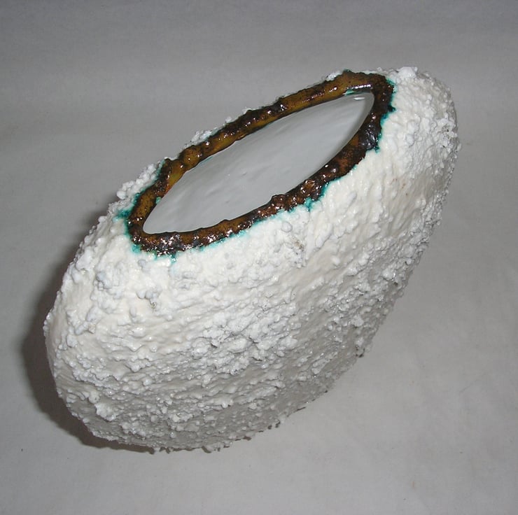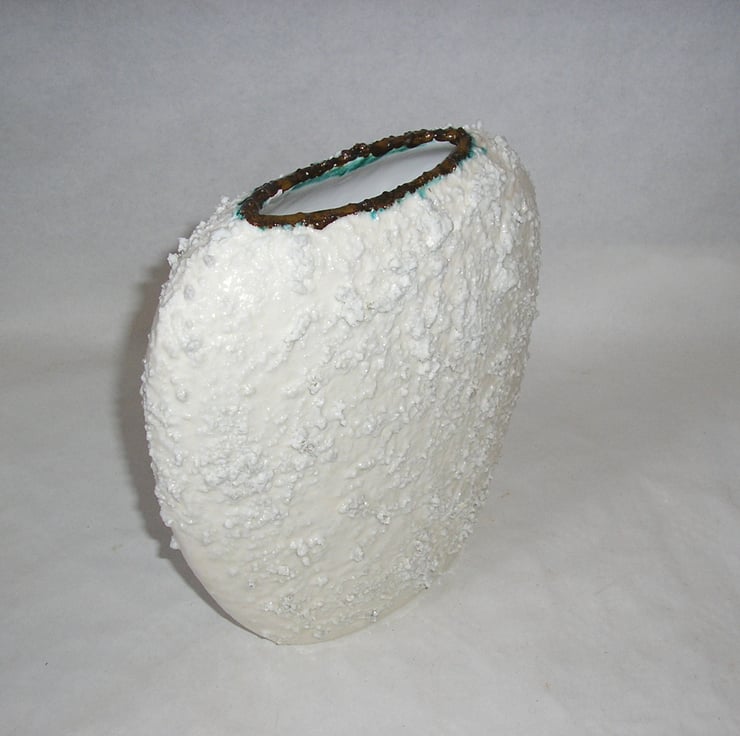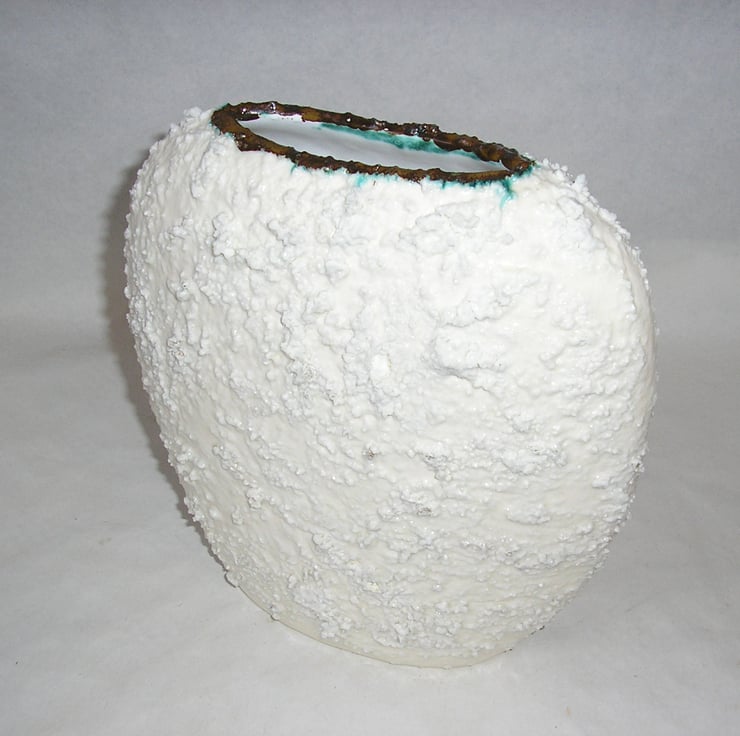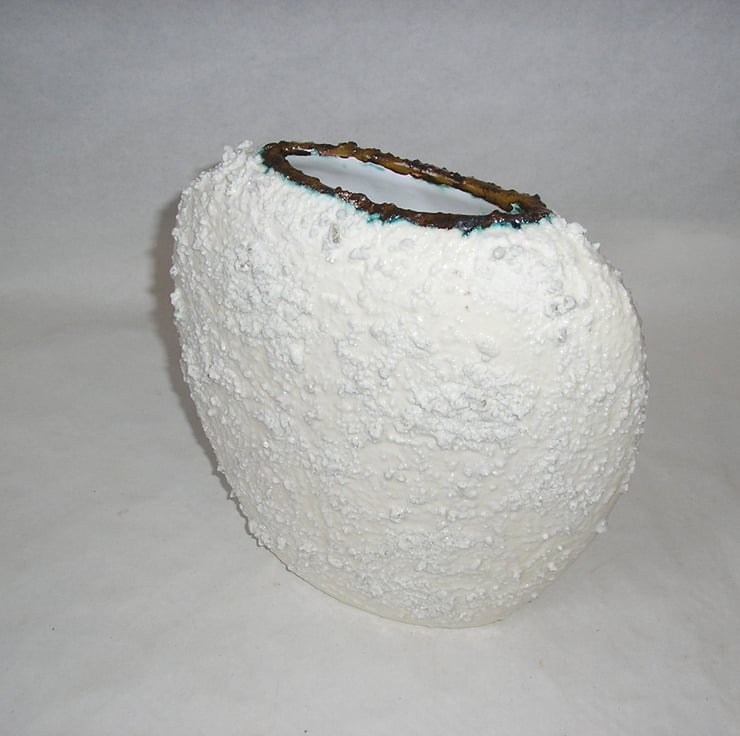CRUMBLE GLAZE IS ROUGH AND CRATERED. THE OUTSIDE OF THE VASE IS A ROUGH WHITE CRUMBLE GLAZE. THE VASE HAS A WHITE SMOOTH EARTHENWARE GLAZE INSIDE. IT WILL NOT HOLD WATER BUT COULD BE USED FOR DRIED FLOWER DISPLAY.