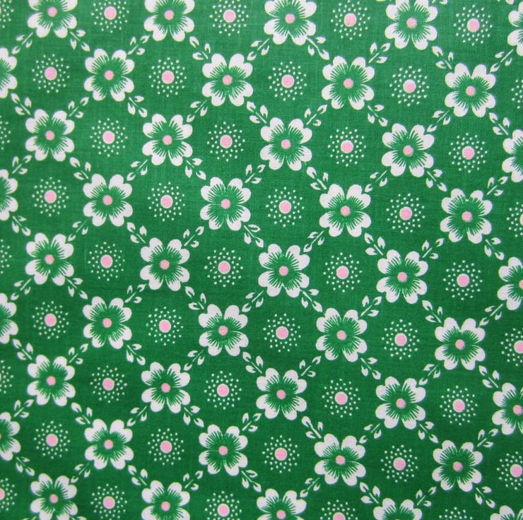 Just over 1 metre of pretty unused vintage fabric in a green, white and pink flower criss - cross design.