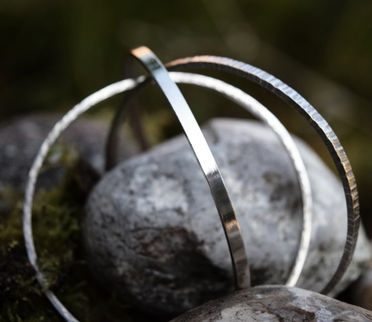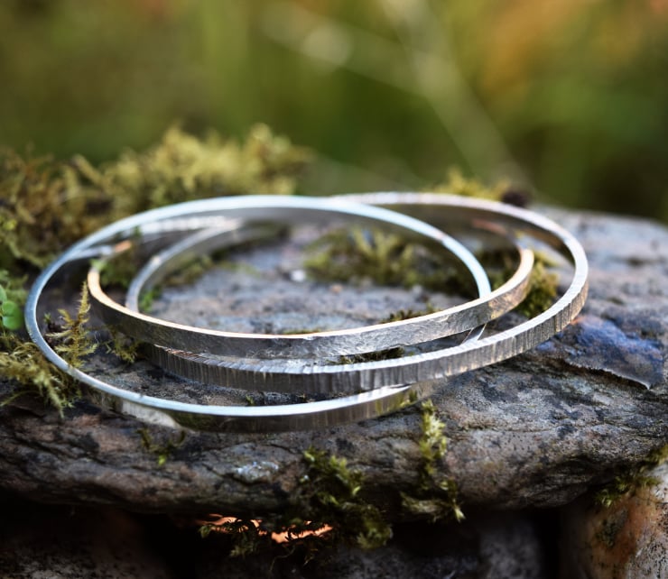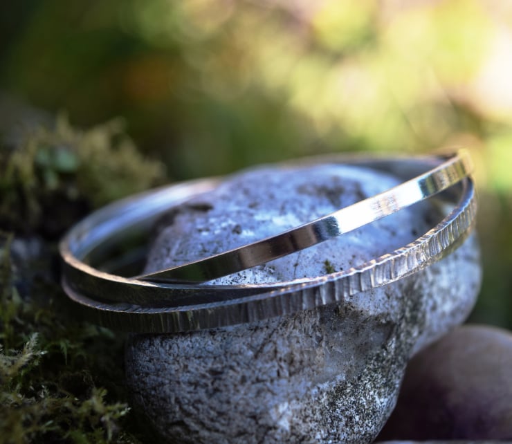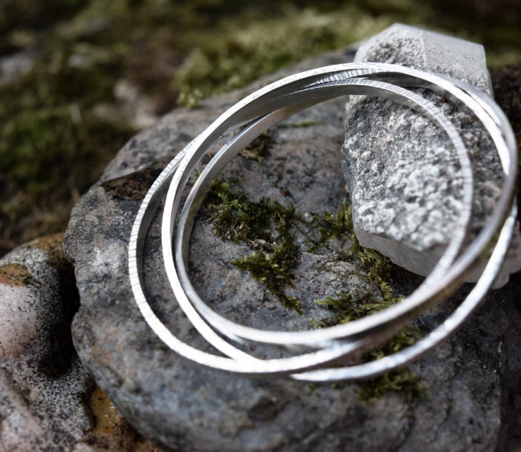 Two of the three Sterling Silver bands are hand textured, with one left plain, to create a triad of distinct but unified bangles. Each band is approximately 3.2mm wide and 1.6mm high, and is fully hallmarked by the Birmingham Assay Office.
