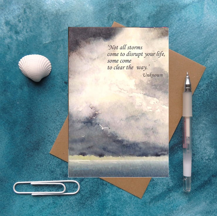 A blank greeting card featuring a quote of encouragement for difficult and stormy times.