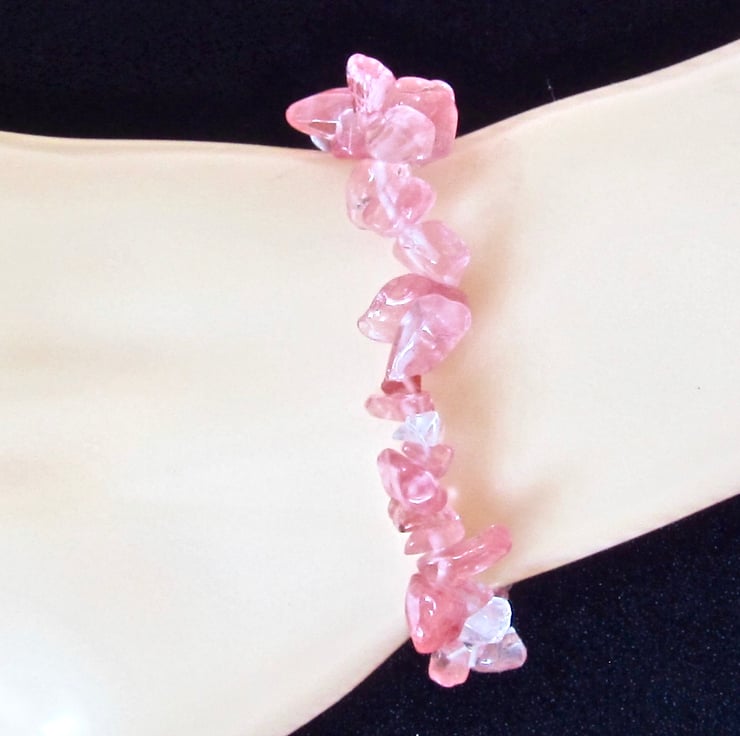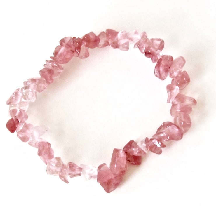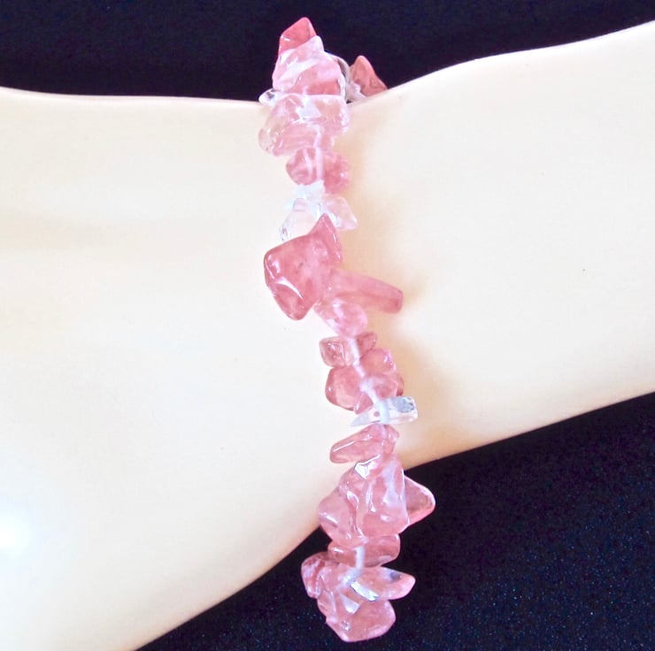 'Red' quartz is a deeper coloured variety of Rose quartz and this bracelet has 59x of these unusually coloured, vibrant stones, drilled and mounted on an elasticated band for ease of putting on and taking off.