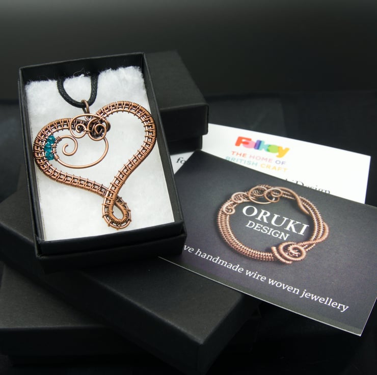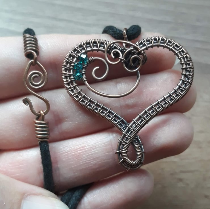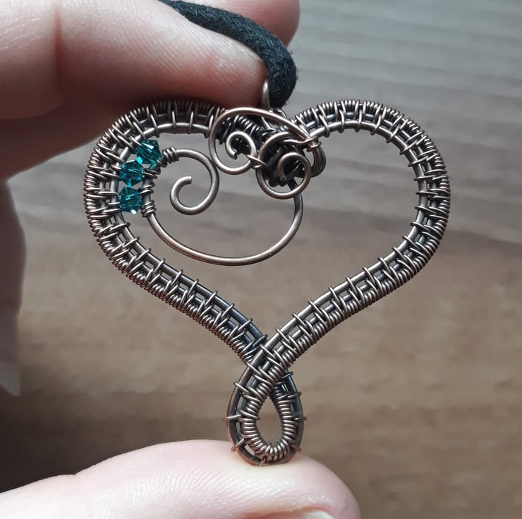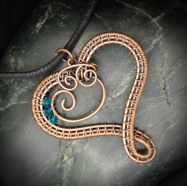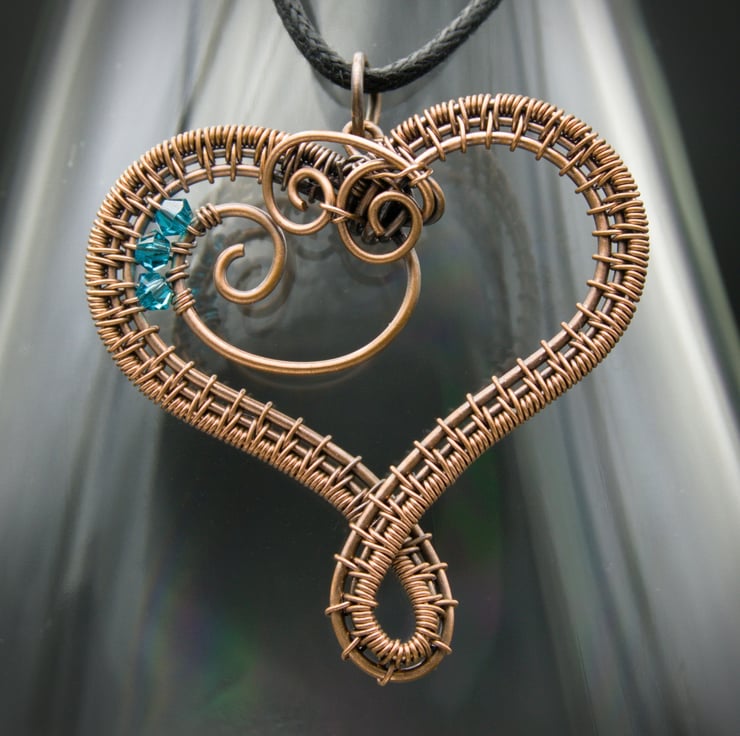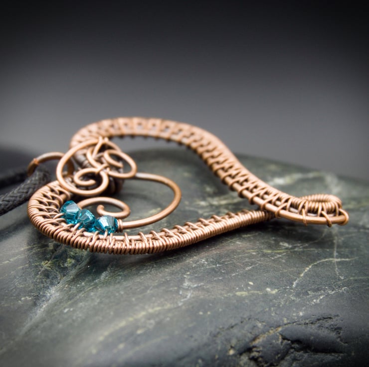 This gorgeous heart pendant has been hand woven from copper wire. Three thicker lengths of wire have been laced together using very fine wire with a flame weave to create an intricate pattern around the curves of the heart shape. I've then finished it by spiralling the ends of the wires & adding 3mm Swarovski® crystal bicone beads. These crystals are Blue Zircon coloured - the colour for December, so it would make a lovely present for a December birthday, or just for someone who loves turquoise!