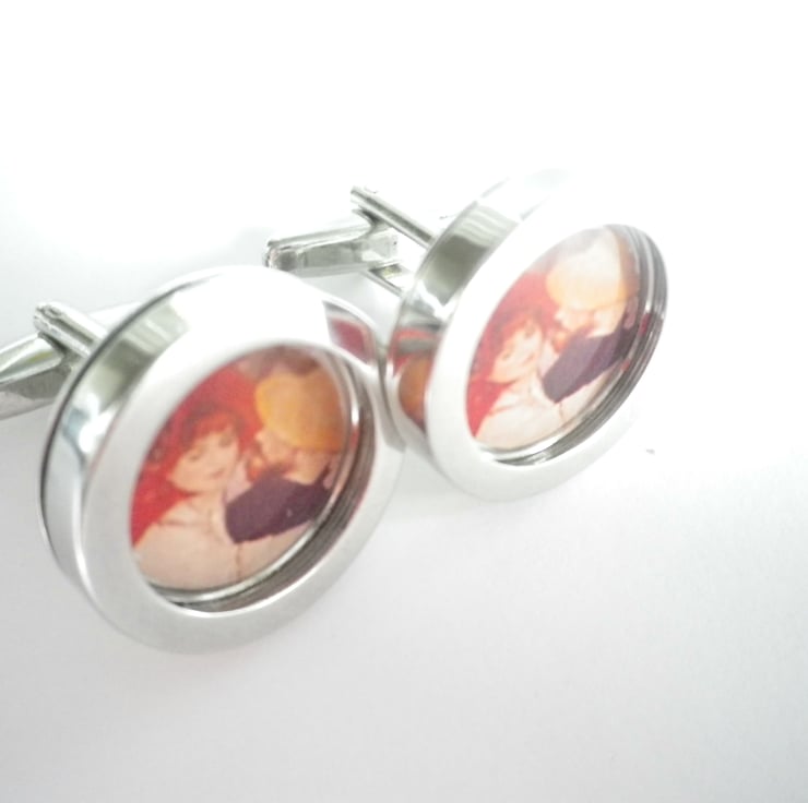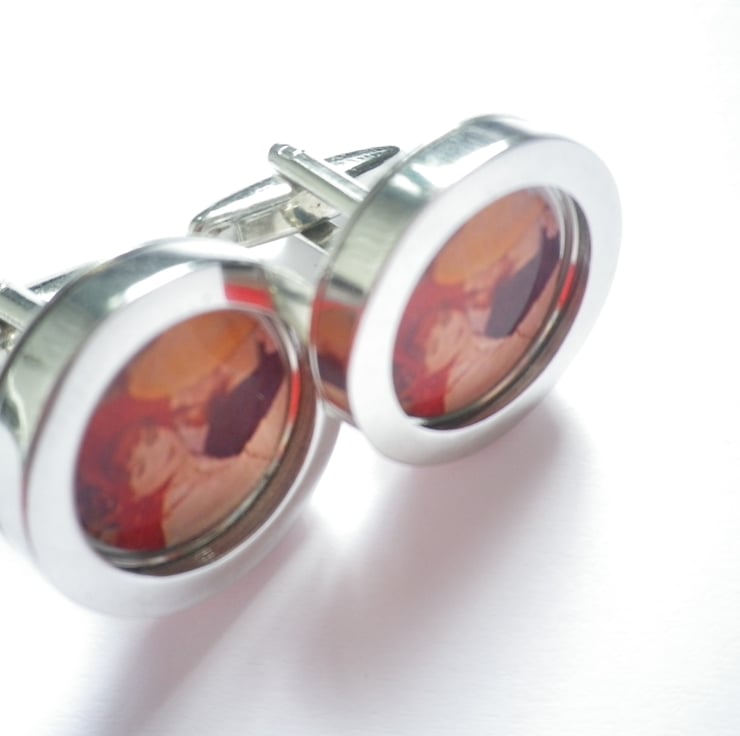The cufflink sets have an even, smooth, highly polished silver finish, with a deep setting and a swivel action 'cigar' shaped shank for ease of use. Crafted from rhodium plated alloy the image has a 15mm ( 3/5" ) protective transparent film, with a neat presentation box.